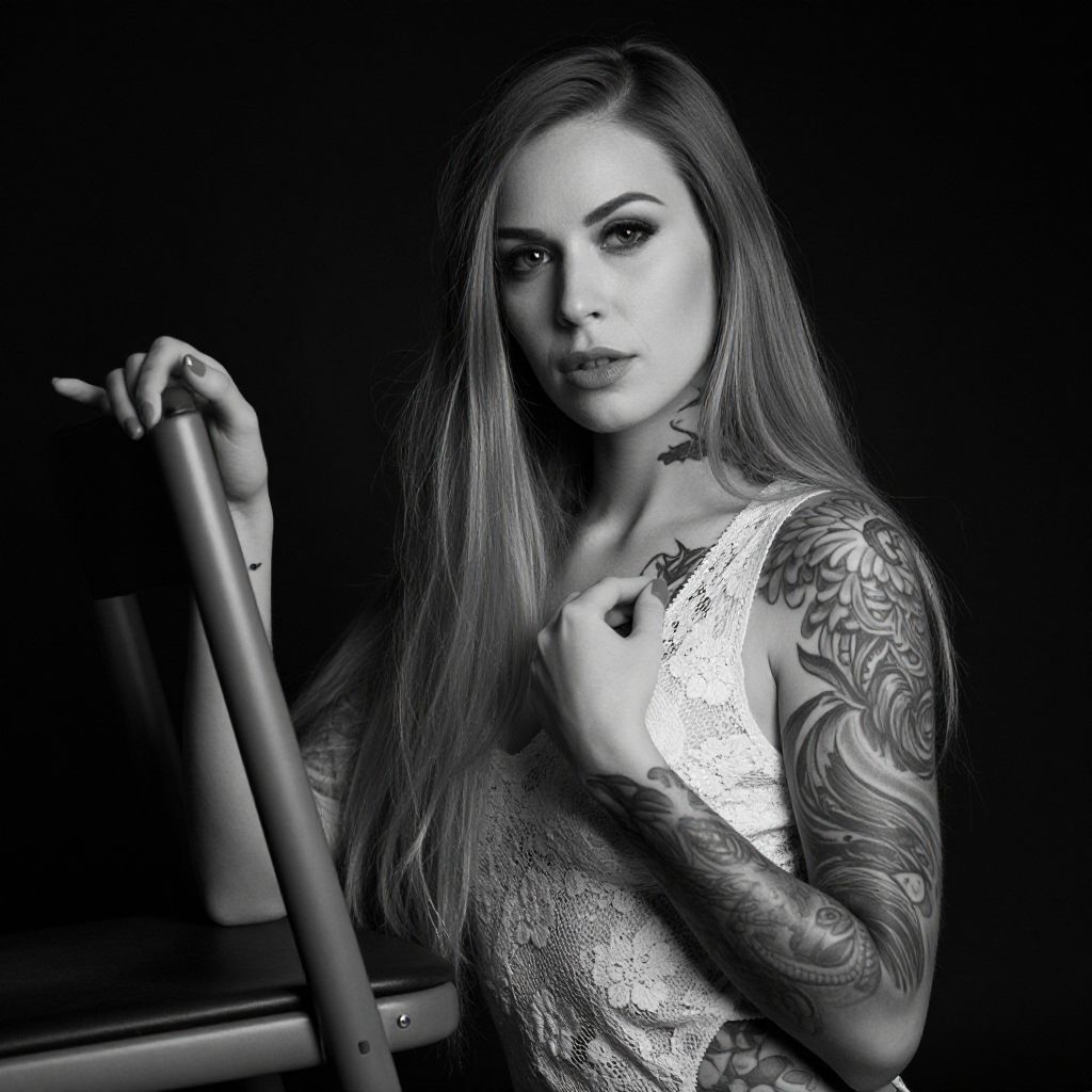 This is a black-and-white photograph of a woman with long, straight hair and fair skin. She has intricate tattoos covering her left arm and part of her neck. She's wearing a sleeveless, lace top and is holding a chair with one hand, while the other rests on her chest. Her expression is neutral, and the background is dark, making her the focal point. The image has a high-contrast, moody feel.