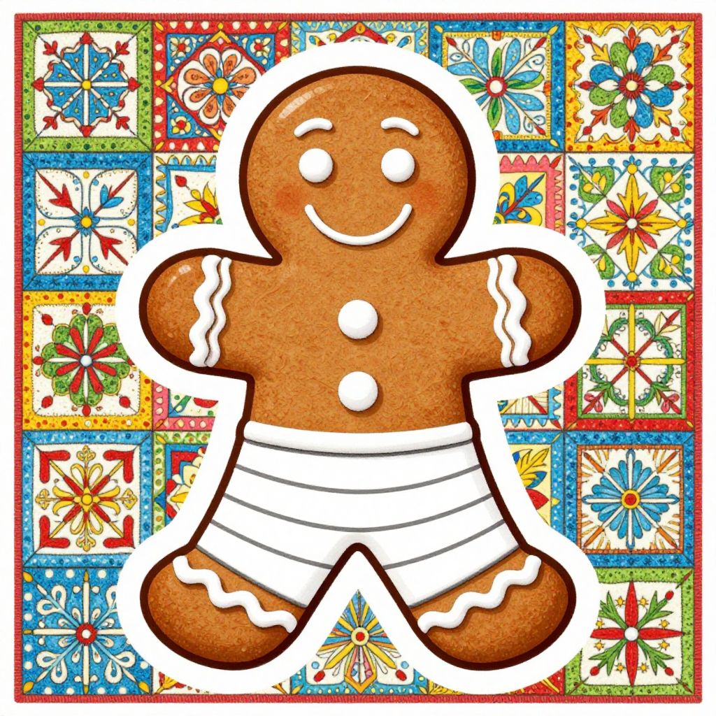 The image depicts a whimsical Christmas gingerbread coloring page for kids. The central figure is a cheerful gingerbread man, adorned with a smiling face, button eyes, and a button nose. He is dressed in a festive outfit with striped sleeves and pants, and his feet are decorated with icing. The gingerbread man is surrounded by intricate, colorful patterns that resemble a quilt or a patchwork design, adding a playful and textured background. The overall composition is balanced, with the gingerbread man centrally positioned, and the patterns providing a vibrant, festive backdrop. The image encourages creativity and coloring, making it an engaging activity for children.