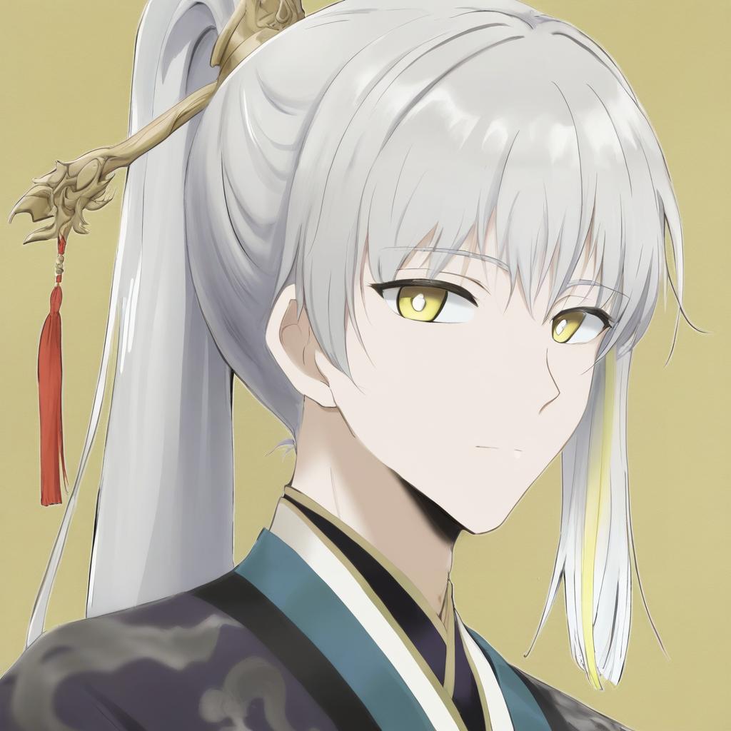 Archer (fate/samurai remnant), fate/samurai remnant, 1boy, yellow eyes, long hair, grey hair, streaked hair, white hair, tassel hair ornament, chinese hairpin, ponytail, high ponytail, sidelocks, hanfu, hanfu, by artist kinfuji, leet