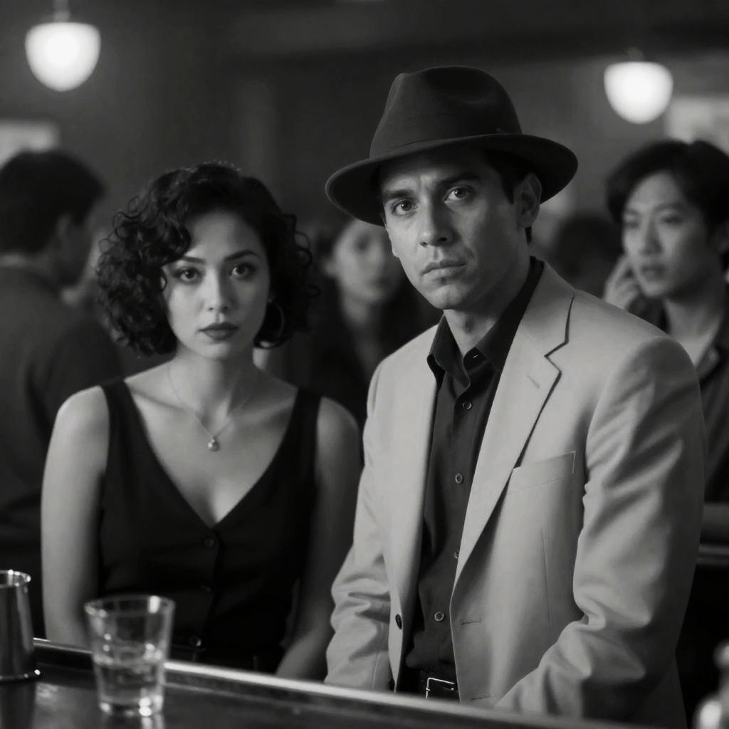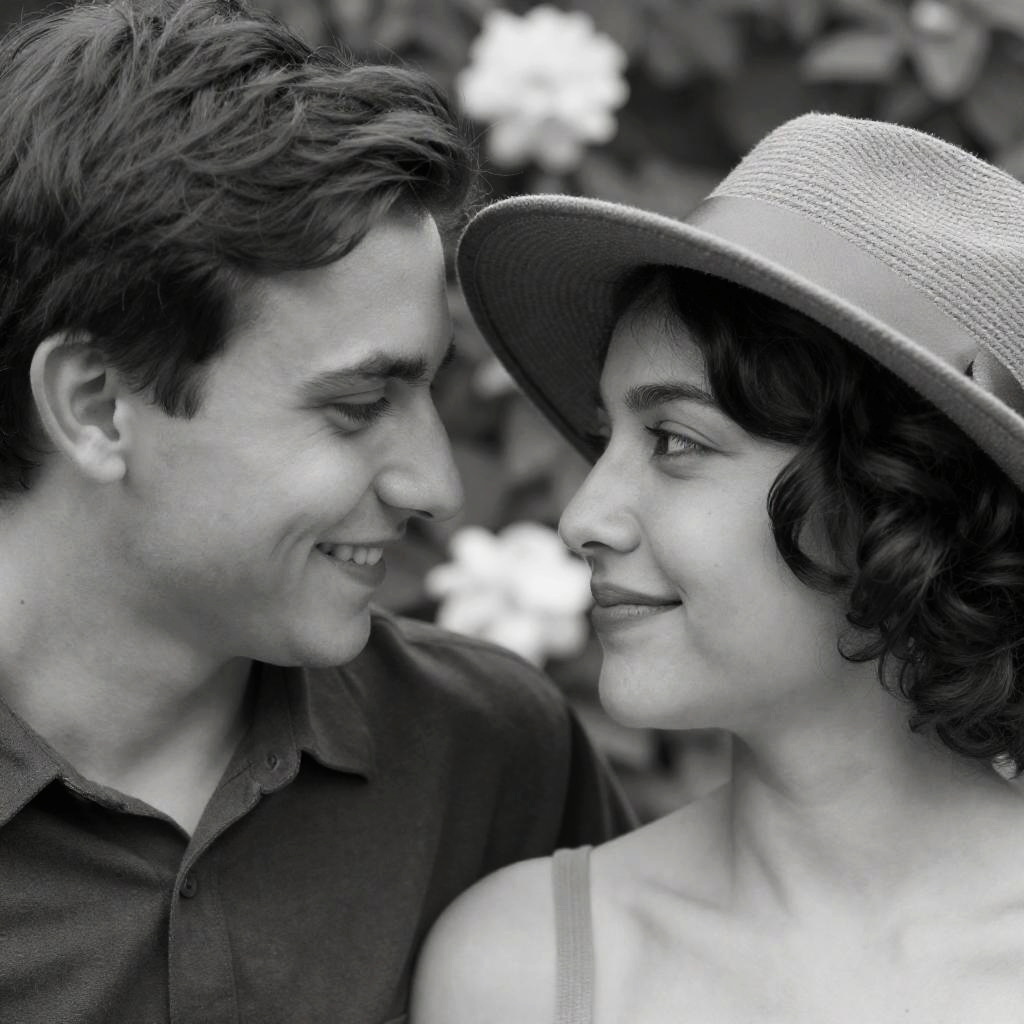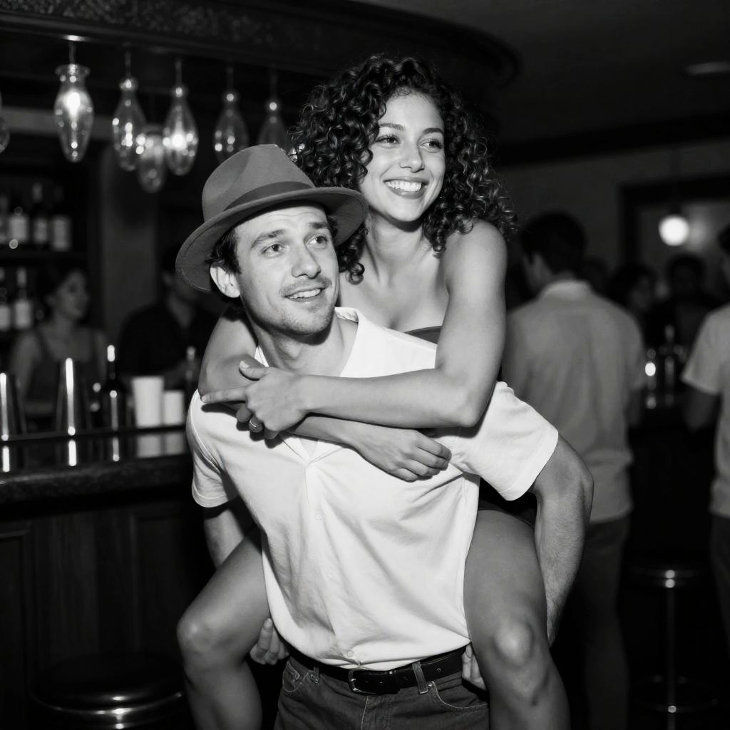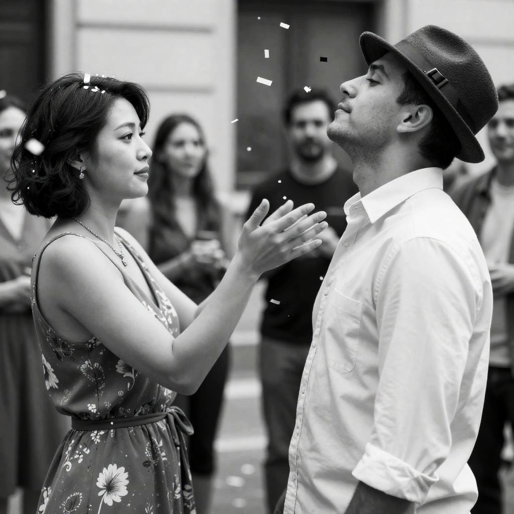 Black and white photograph. Woman with short hair, floral dress, and necklace on left. Man in fedora and light shirt, head back, splattered with confetti on right. Hand reaches from left, spraying confetti. Multiple blurred people in background.