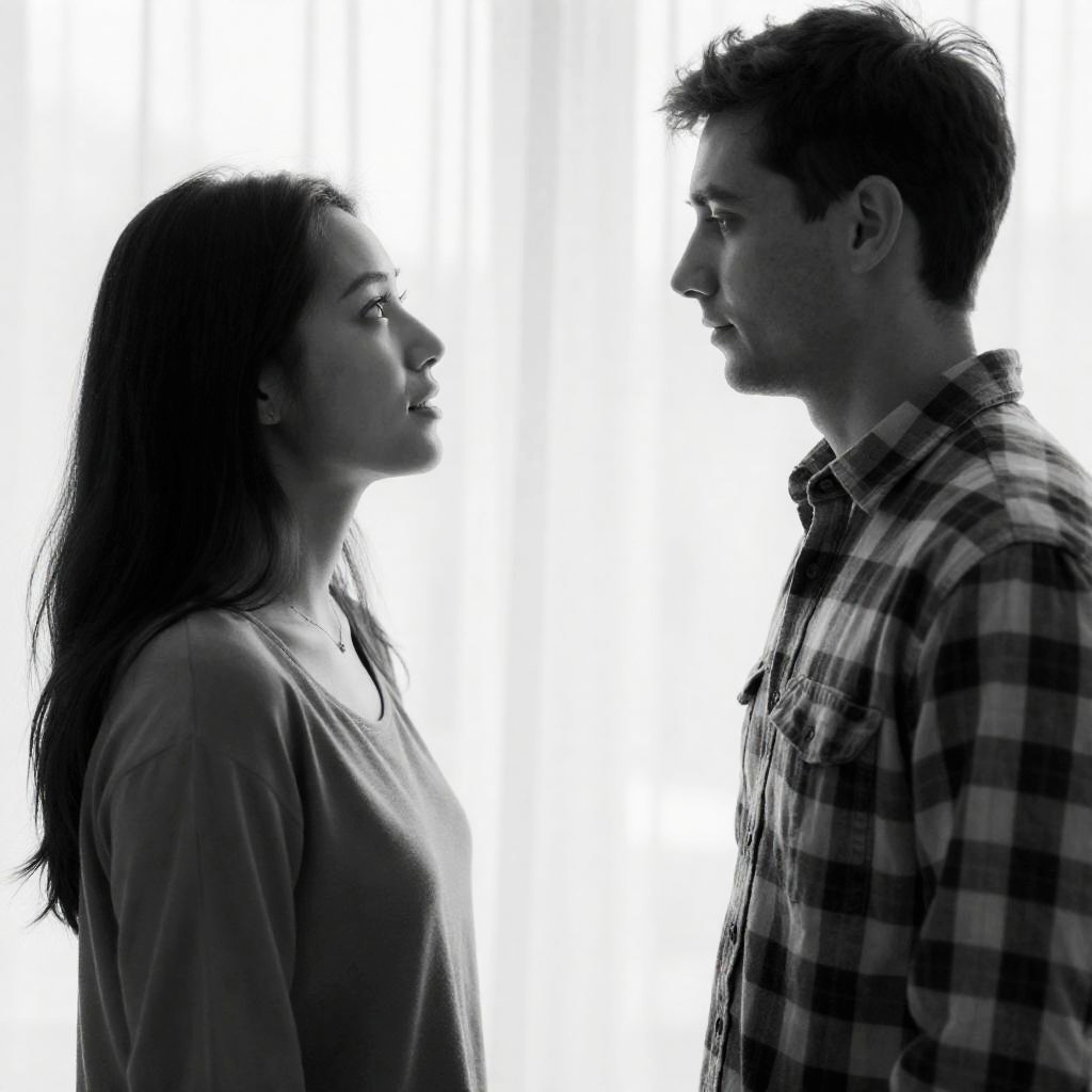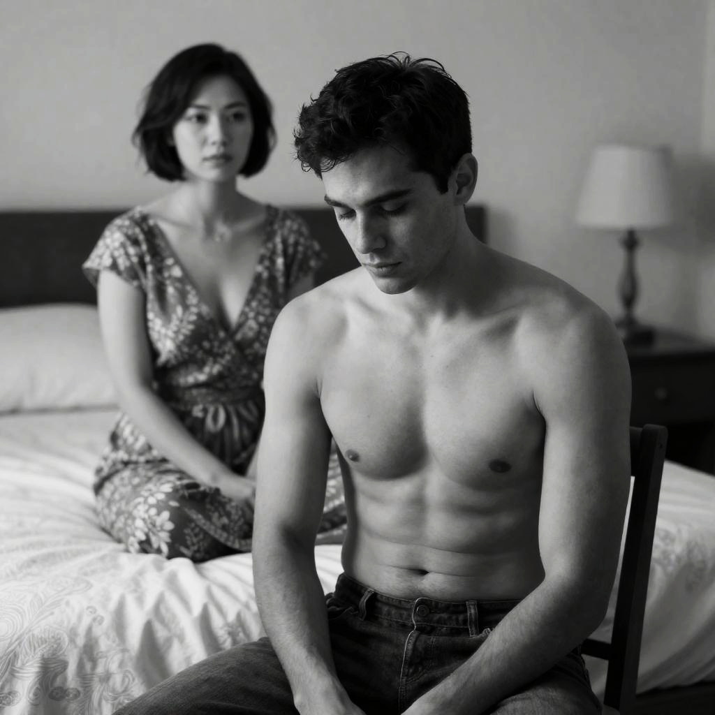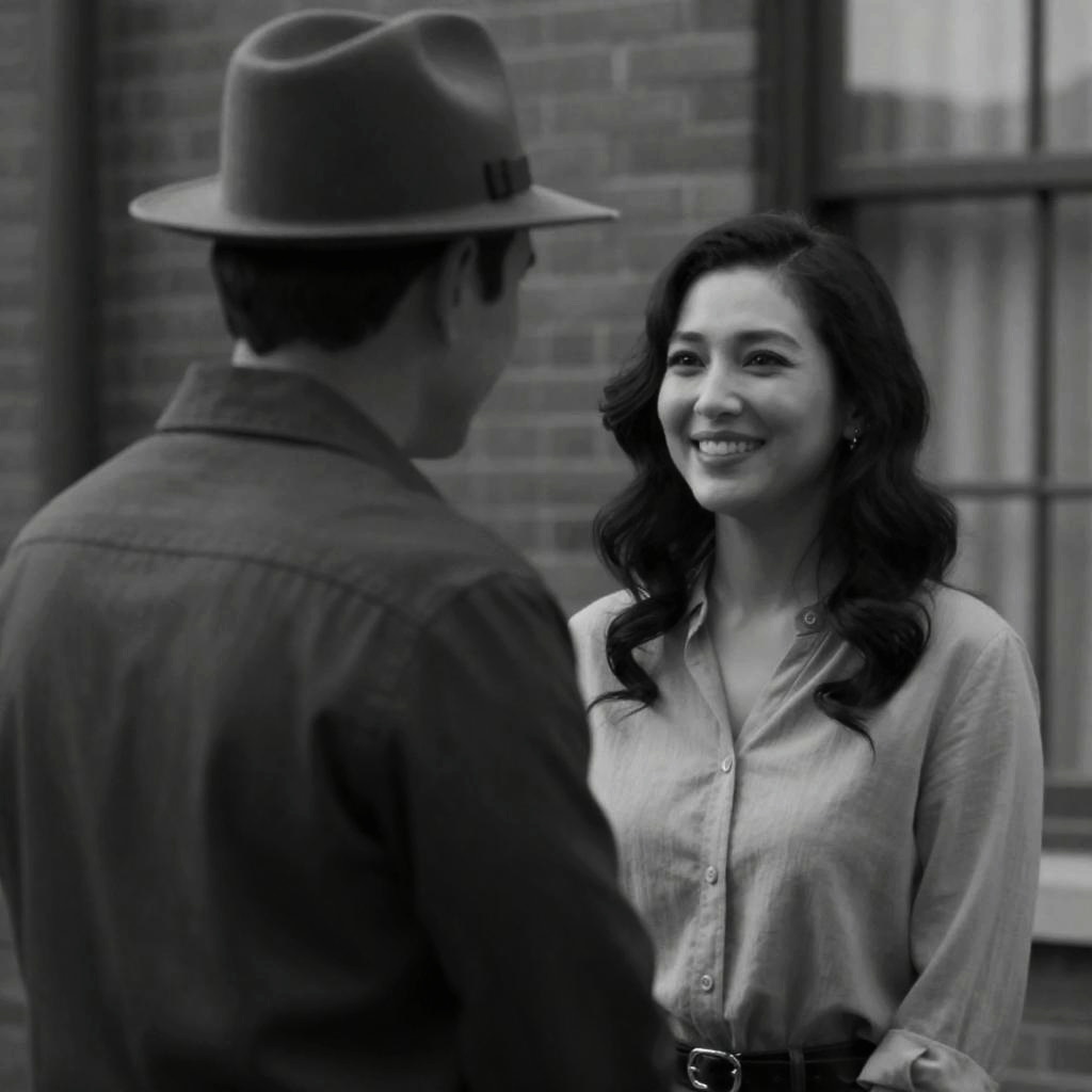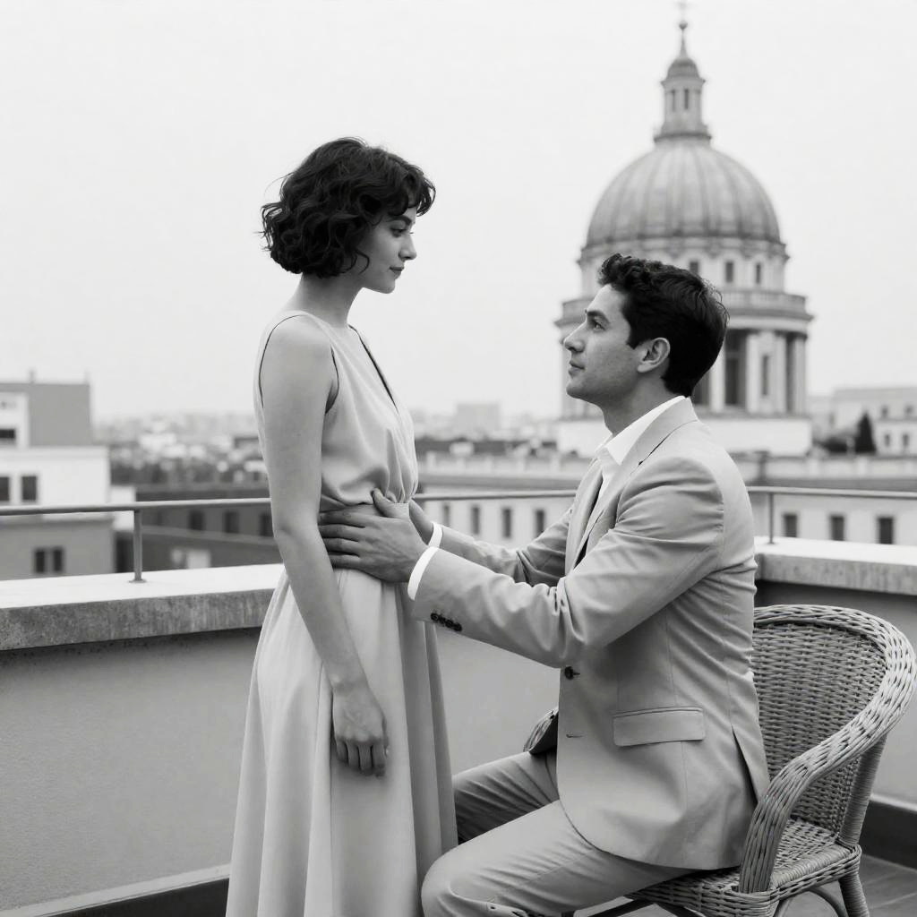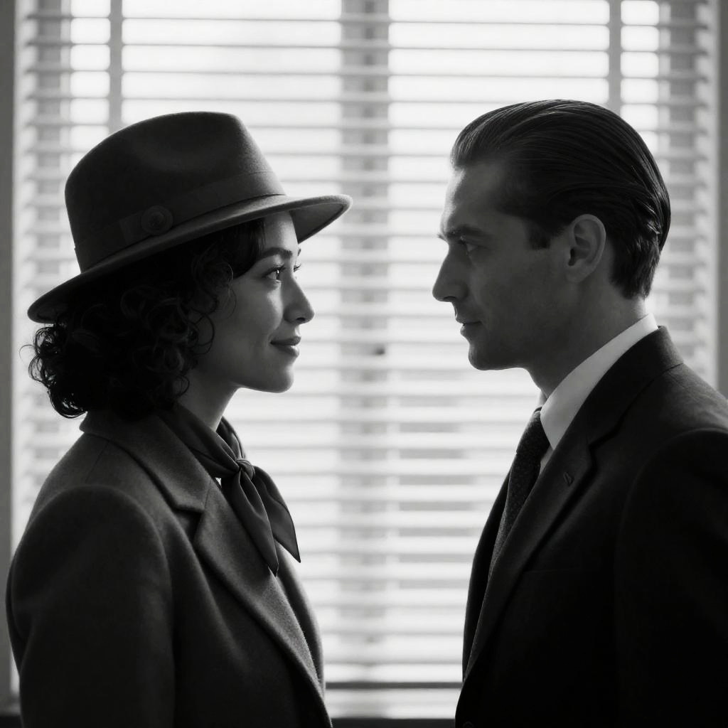 Black and white photograph. Woman with short hair, floral dress, and necklace on left. Man in fedora and light shirt, head back, splattered with confetti on right. Hand reaches from left, spraying confetti. Multiple blurred people in background.
