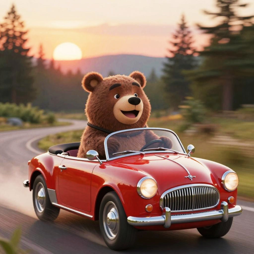 Bear driving a car, cartoon style, forest background, colorful sunset, anthropomorphic animal, shiny red vintage convertible, joyful expression, dynamic motion blur