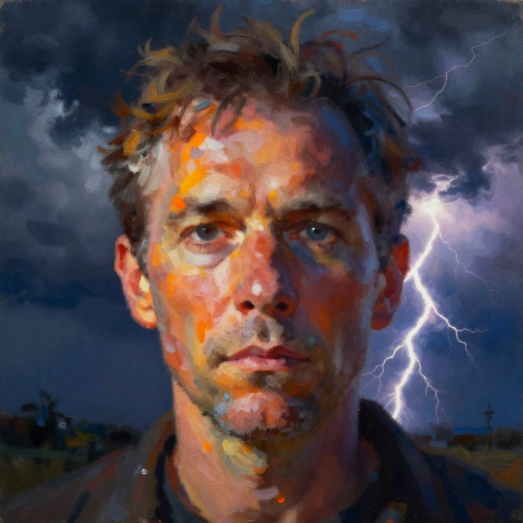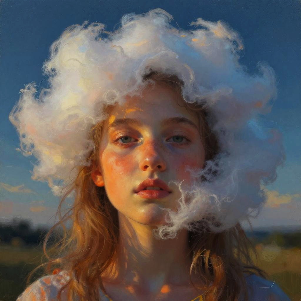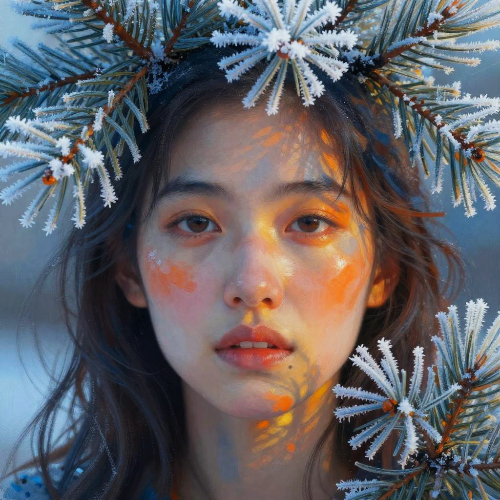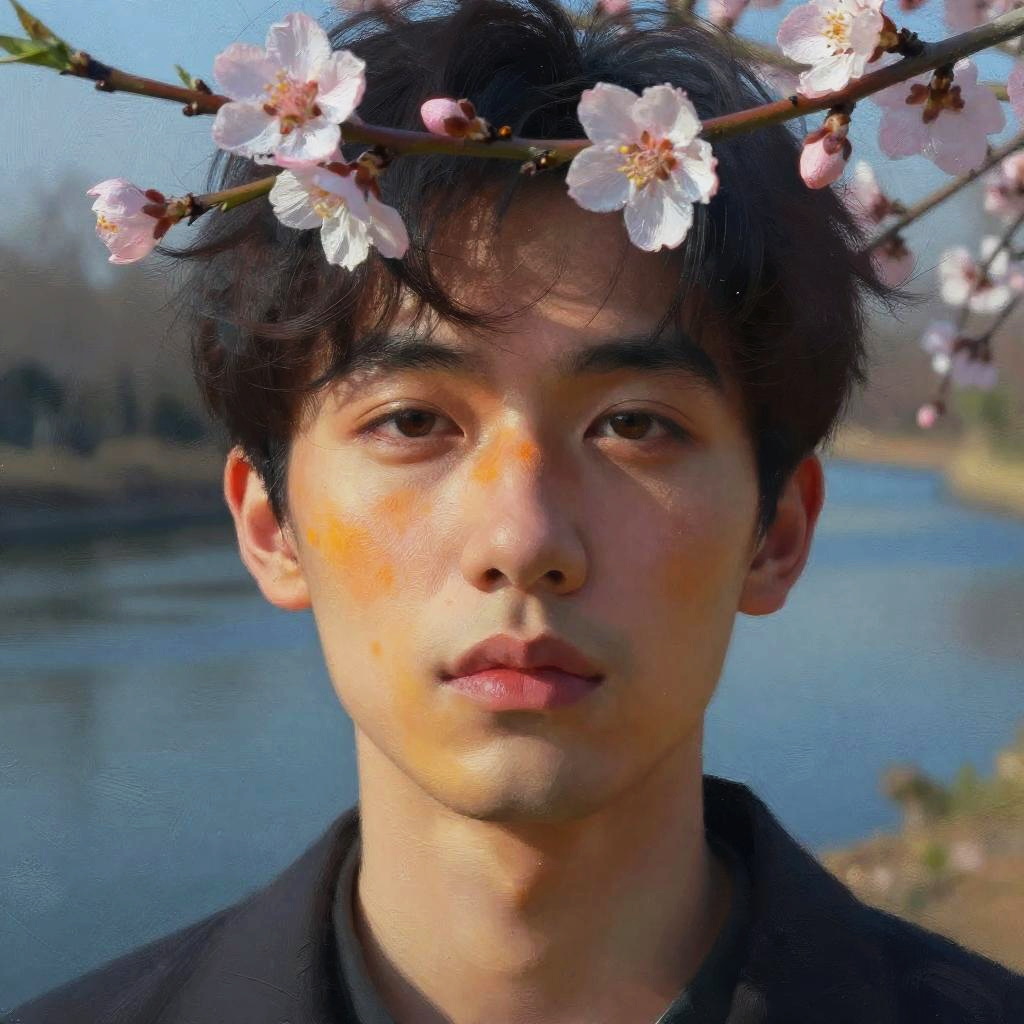 Surreal portrait of a young man's face, with peach blossoms and gentle river breeze seamlessly blending into her features. The face is rendered in a textured style, with intricate brushstrokes capturing both the softness of human expression and the rawness of natural elements. Warm hues of orange and yellow from the peach blossoms radiate across her face, contrasting against cooler blue and icy tones. The composition evokes a sense of serenity, with high detail and dynamic light, merging human beauty with the majesty of nature.