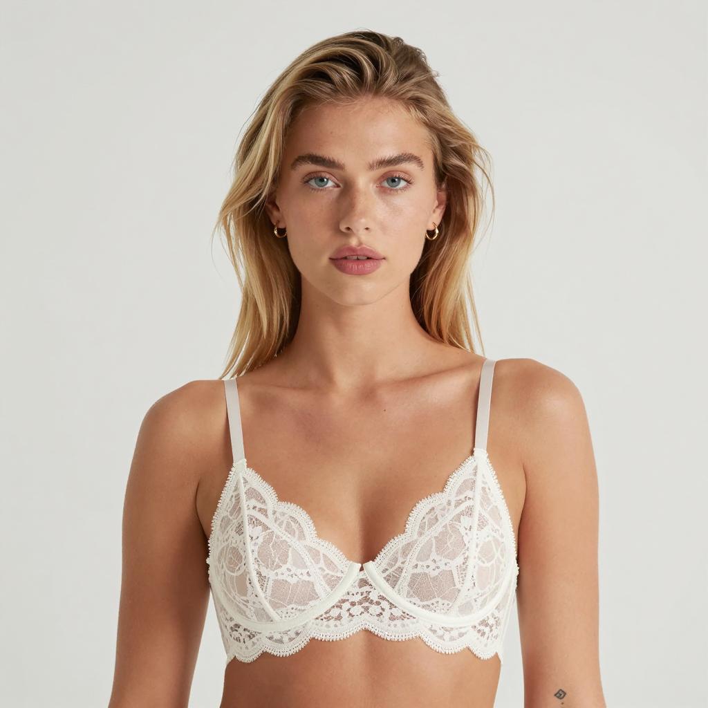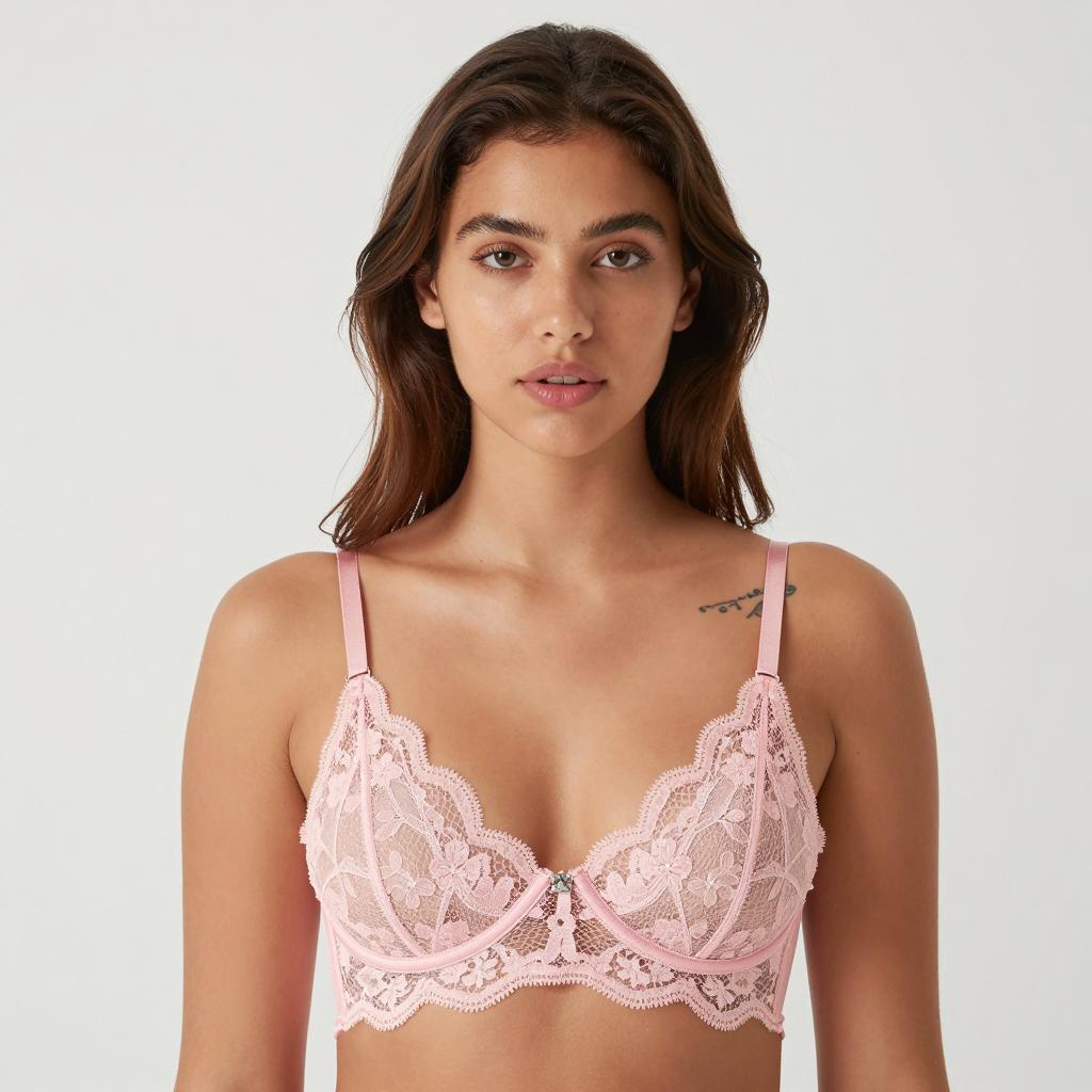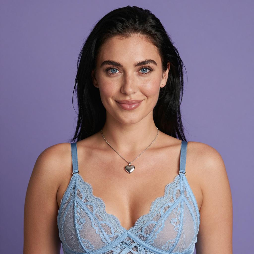 Woman with pale skin and black hair, wearing a light blue lace bralette. She has small breasts, a tattoo on her left arm, and another tattoo on her right arm. She is smiling slightly. White background. Upper body shot.