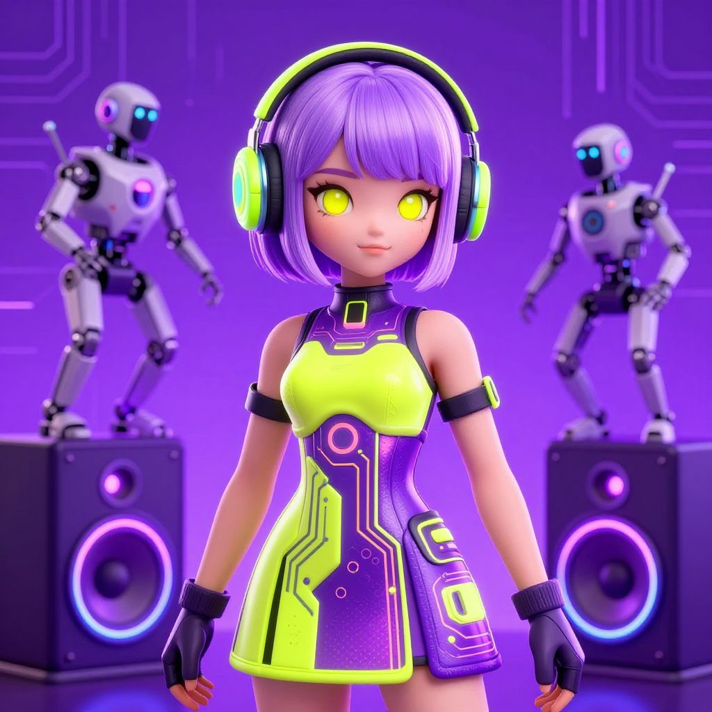 3D rendered image of a futuristic girl with lavender bob haircut and bright yellow eyes, wearing a cyberpunk style dress with neon yellow and purple circuit patterns. She is surrounded by two neon-lit robotic speakers against a vibrant purple background with digital circuit motifs, wearing matching neon headphones and gloves.