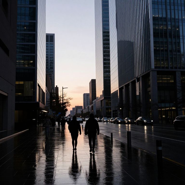 Reflective skyscrapers line a wet urban street, mirroring the distant cityscape under a soft twilight sky, while silhouetted figures walk along the mirrored pavement, creating a surreal interplay of light and shadow.