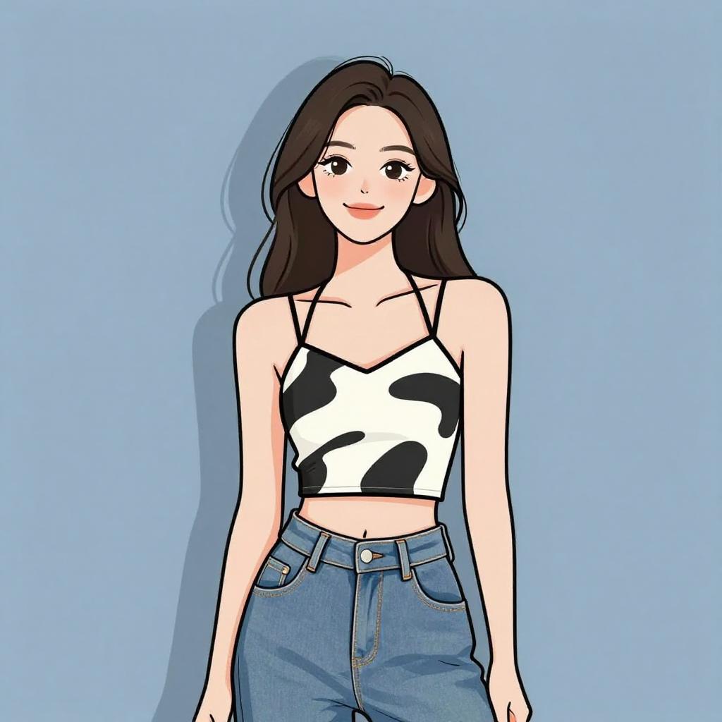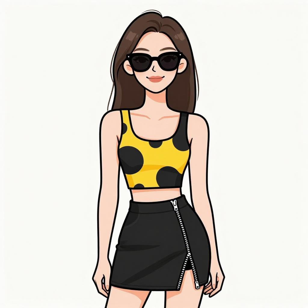 Woman with pretty face and pretty hair. smiling Woman, trendy fashion, black strappy crop top with structured cups, high-waisted shorts in a black and white abstract print, oversized black sunglasses. --sref 1467