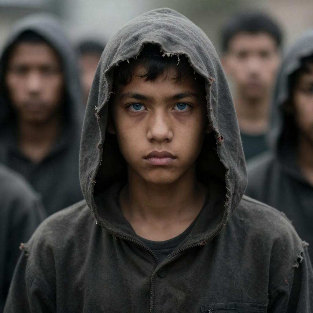 Photograph of a serious young man with light brown skin and intense blue eyes, wearing a tattered, dark gray hood that casts shadows over his face. He is surrounded by blurred, similarly dressed individuals in the background. The image has a gritty, realistic style with high contrast and muted colors.