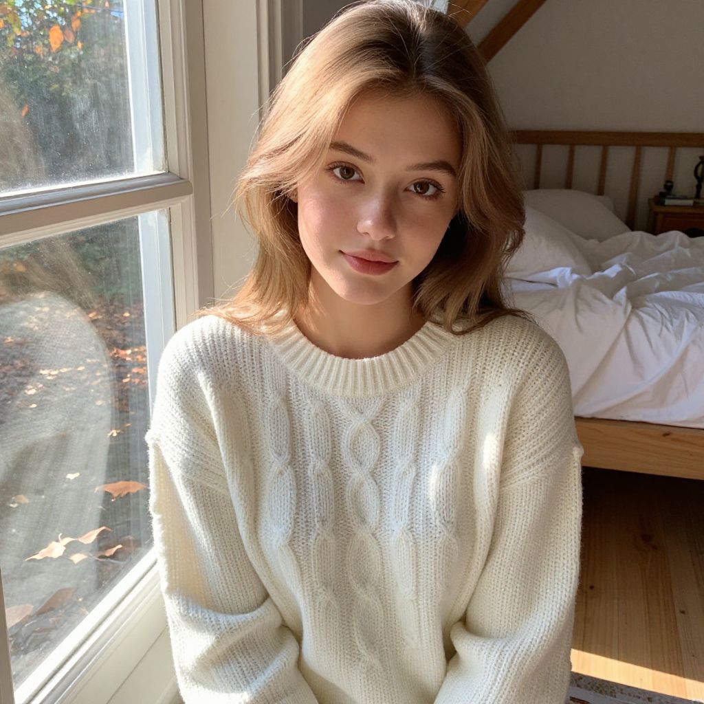 A young woman with warm brown eyes and soft blonde hair is wearing a cozy white knit sweater with subtle cable patterns, sitting by a window in a sunlit cottage bedroom with wooden floors and autumn leaves outside. The lighting is natural, morning sunlight streaming in, highlighting the texture of the knit fabric.