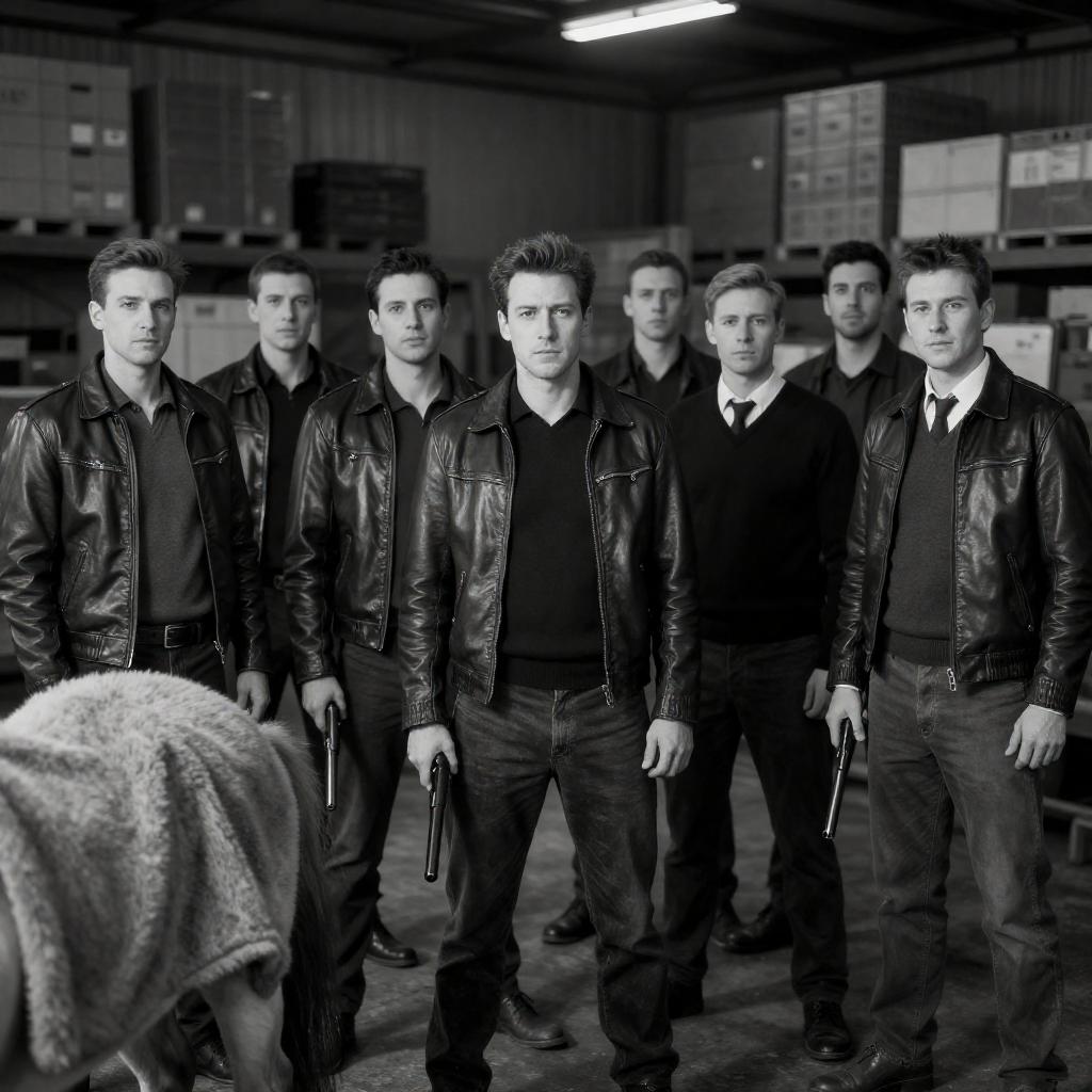 Black-and-white photograph featuring seven men standing in a warehouse with crates and shelves in the background. Six men are wearing leather jackets and sweaters, and one man is dressed in a dark sweater and tie. Two men in the foreground hold guns. A horse with a blanket is visible in the foreground. All men have serious expressions.