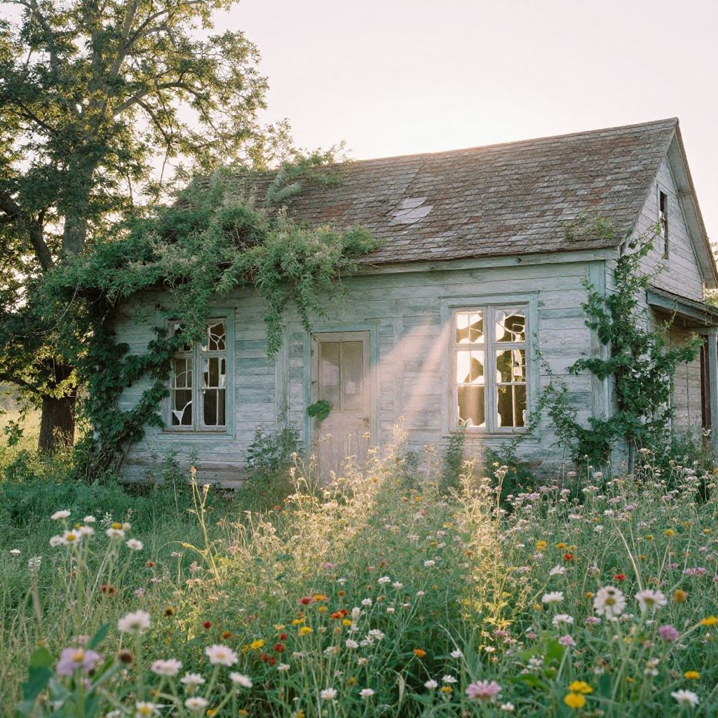 Photograph of an old, weathered, white wooden house with vines, surrounded by a sunlit, wildflower-filled meadow, with sunlight streaming