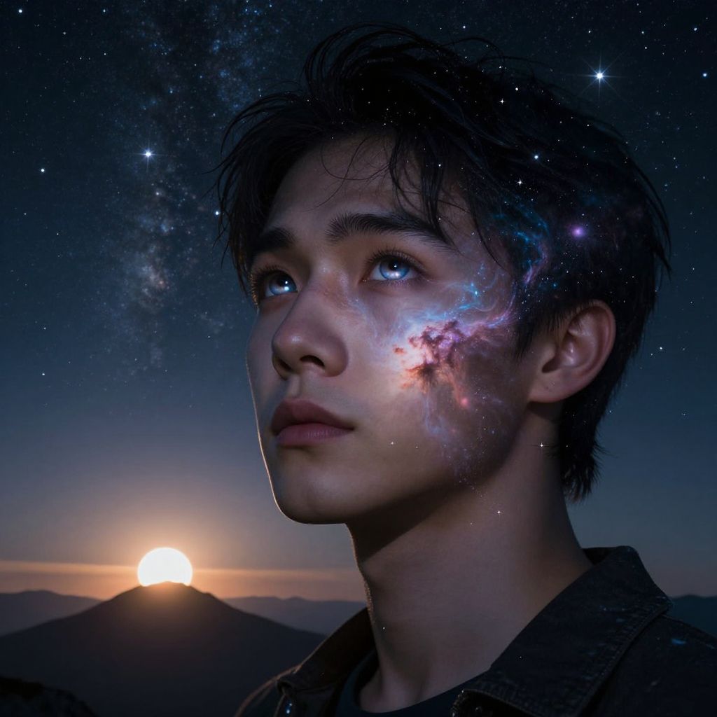Photographic-style digital artwork featuring a young Asian man with short, messy black hair, gazing up at a starry night sky. His face is illuminated by a glowing, cosmic-like light on his right cheek. The Milky Way galaxy is superimposed over his hair and forehead. In the background, a bright, setting sun is partially visible behind a mountain silhouette. He wears a dark-colored shirt, and his expression is one of wonder and contemplation. The overall color palette includes deep blues, purples, and oranges, creating a mystical, otherworldly atmosphere.