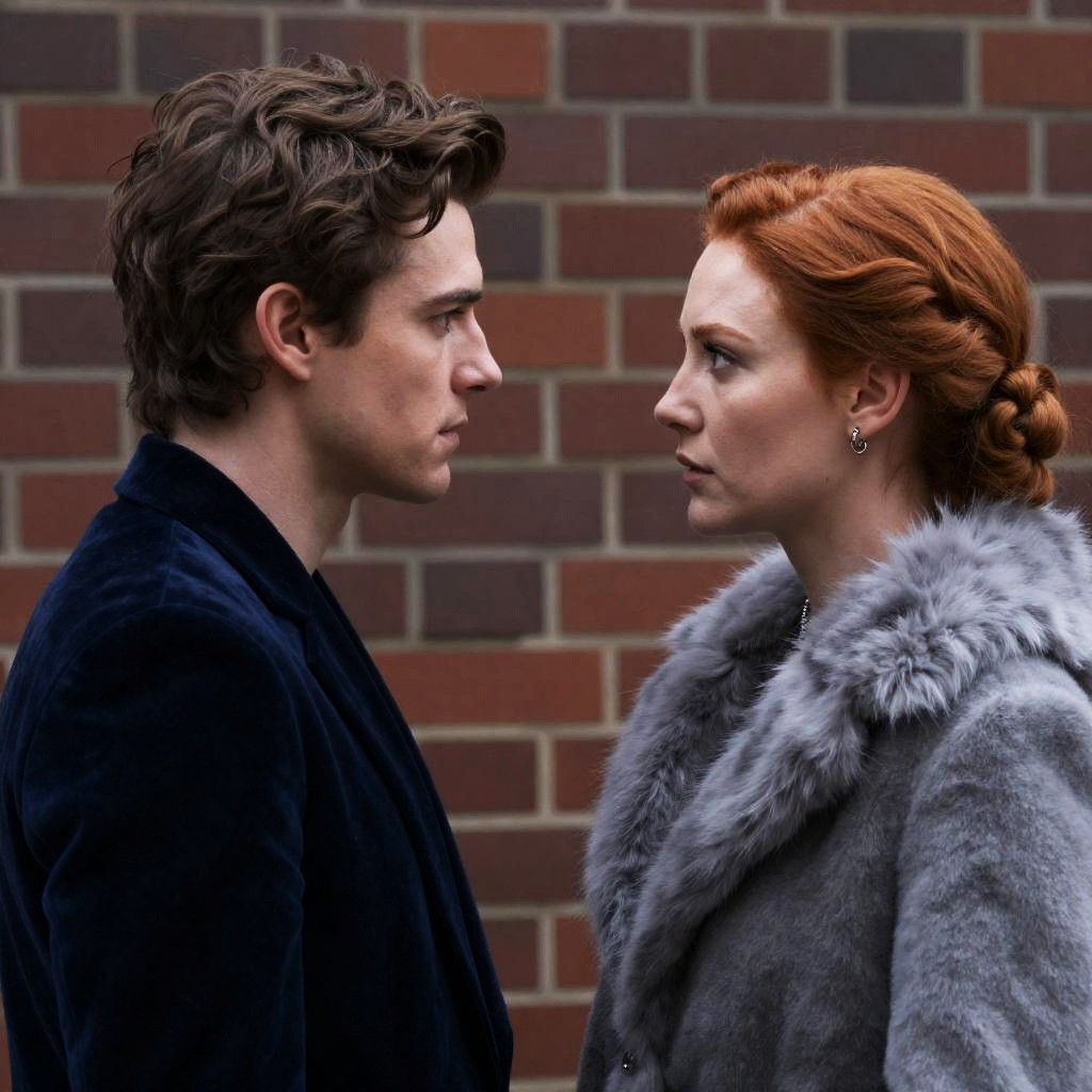 A woman with red hair, wearing a dark dress, straddles a man lying on the floor, his head turned to the side. The room has wooden floors, lit candles, and people lying unconscious in the background. The man wears black leather. The woman's expression is intense. The scene is dimly lit, with ornate furniture and curtains.