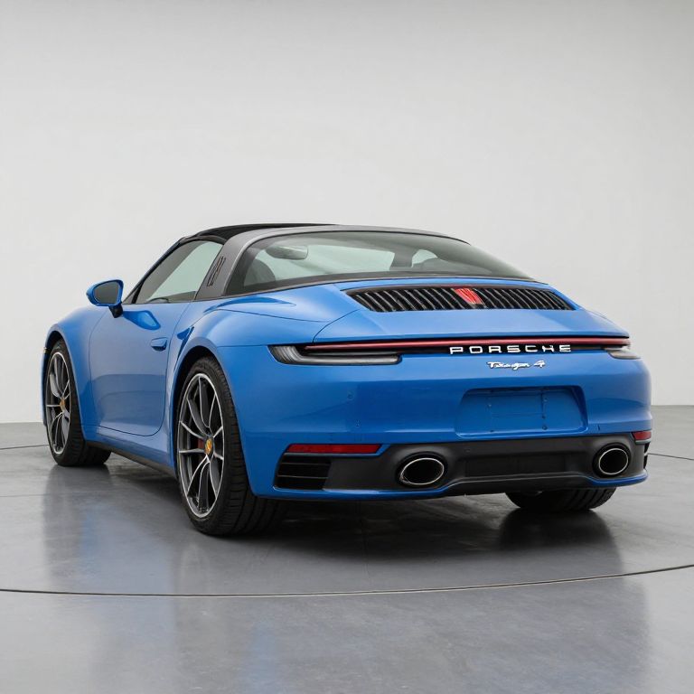 Blue 2021 Porsche 911 Targa 4 showcased in a rear-angle view, featuring dual exhausts, a prominent \"PORSCHE\" emblem, and \"Targa 4\" script beneath its sleek taillights, set against a minimalist studio backdrop.