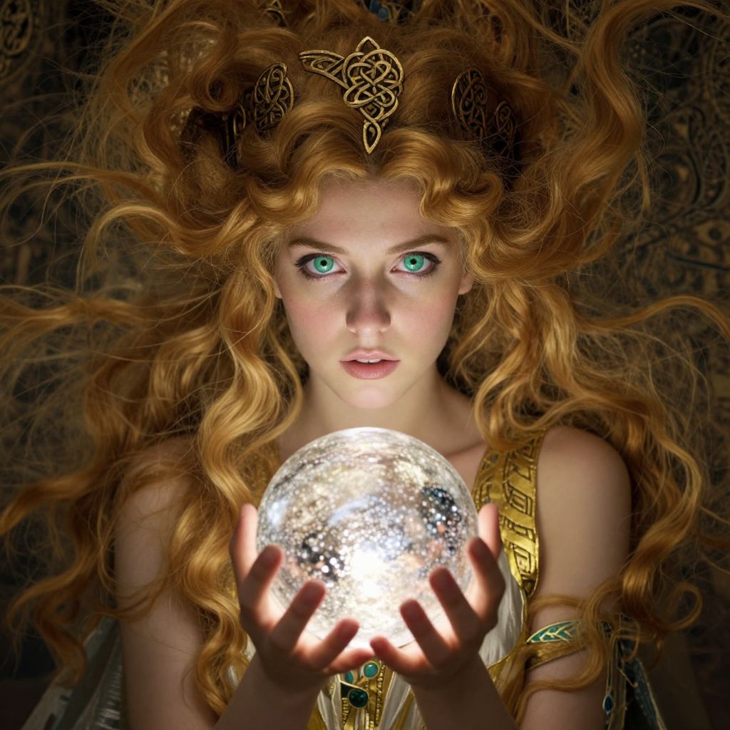 Digital artwork of a fair-skinned, green-eyed woman with wild, curly red hair holding a glowing, silver sphere, wearing a golden, Celtic-inspired