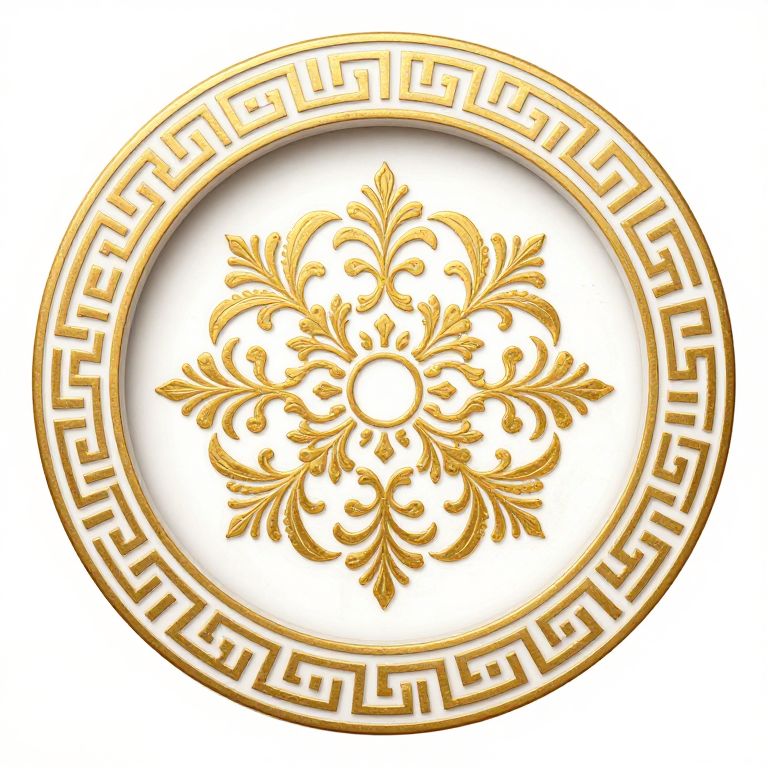 A round, symmetrical Greek-style picture frame with intricate gold and white patterns, featuring a central floral motif and no depth of field or soft gradients.