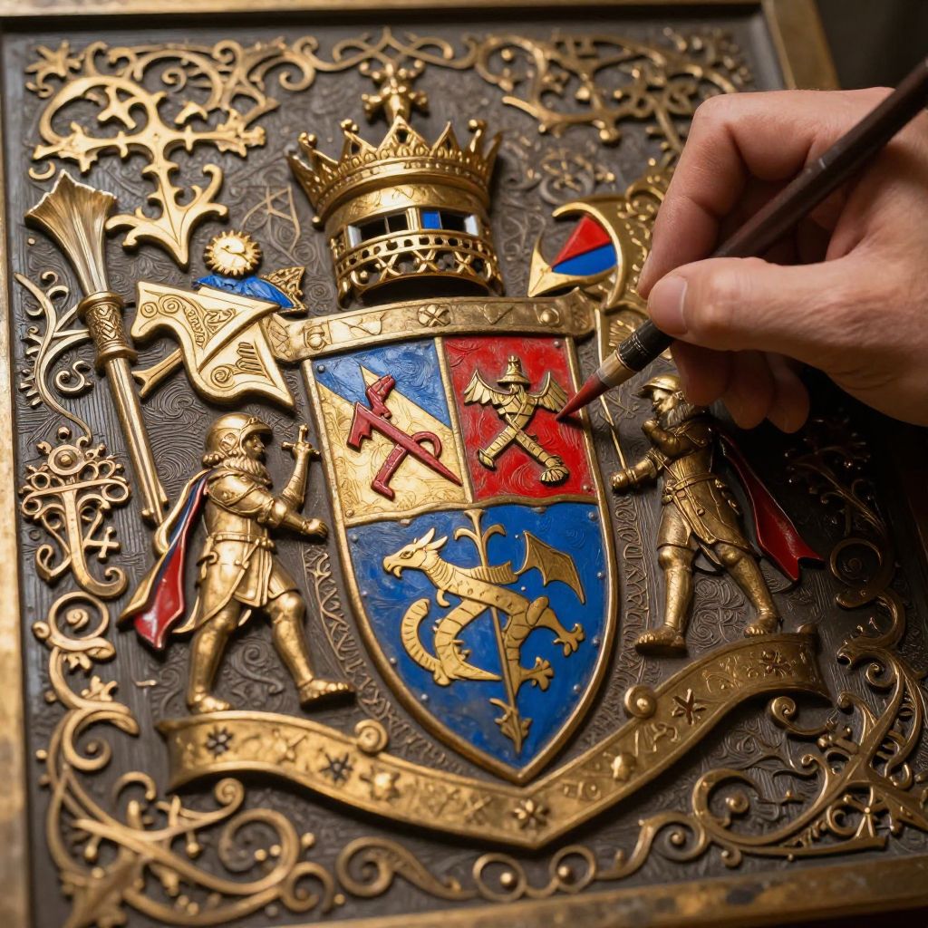Crest maker designing an elaborate medieval family crest, intricate heraldic symbols, rich colors of gold, red, and blue, detailed metal engraving style, ornate shield background, an atmosphere of old European tradition and craftsmanship, high resolution.