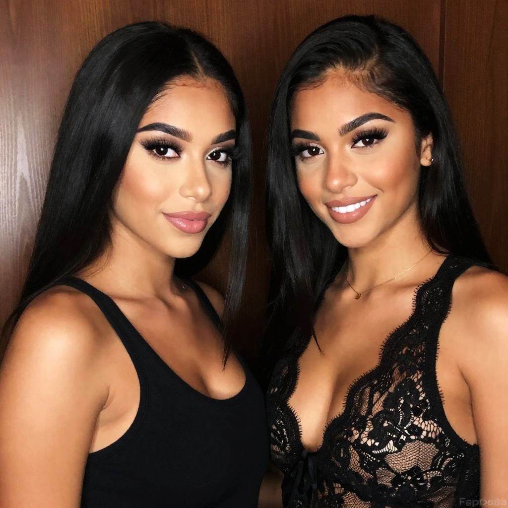 Photograph of two young women with long, straight black hair and light brown skin, standing close together. Both have full, arched eyebrows, heavy eyeliner, and long lashes. The woman on the left is wearing a black tank top, showing her shoulders, while the woman on the right has a black lace top with a deep neckline, revealing cleavage. They're smiling at the camera, with a dark wooden background behind them. "Fapopedia" watermark in the bottom right corner.