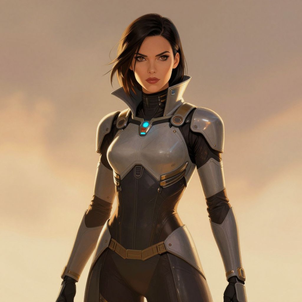 Digital artwork of a confident, dark-haired woman in a futuristic, silver and black armored suit with glowing blue gem, standing against a golden sunset.