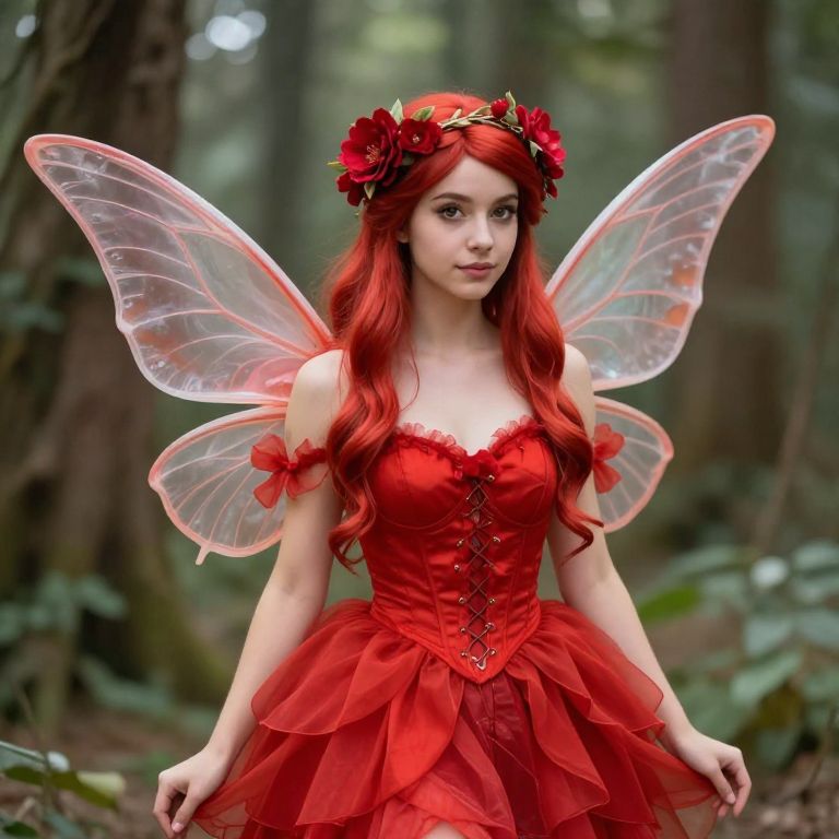 Ruby The Red Fairy, fairy in a red dress with wings and a flower crown