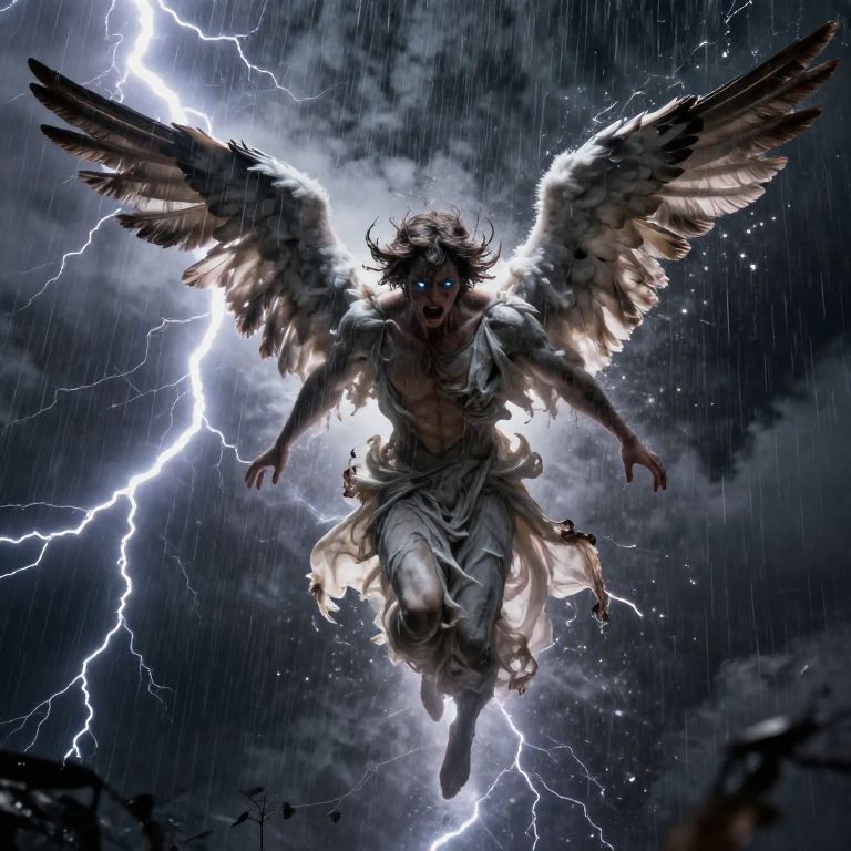 Angel falling from sky, framed by lightning bolts and heavy rain, dramatic chiaroscuro lighting highlighting anguish and power, detailed feathers and glowing eyes, dark fantasy style with intense contrast and dynamic composition