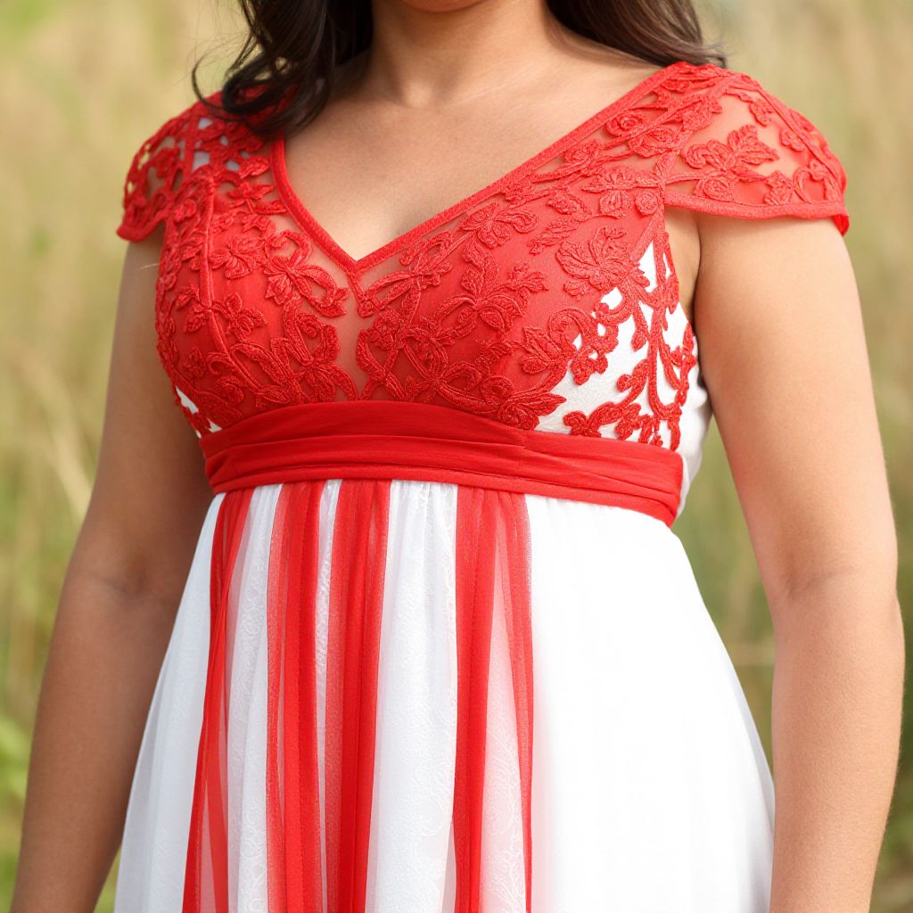 Photograph of a woman's torso and upper waist, showcasing a red and white dress. The dress features a red lace V-neckline with floral patterns and short lace sleeves, while the lower part has vertical red and white stripes. The woman has medium brown skin and long, wavy black hair, partially visible. The background is blurred, with green and yellow hues, suggesting an outdoor setting with grass. The image focuses on the dress's texture and color contrast, highlighting the intricate lacework and the flowing fabric.
