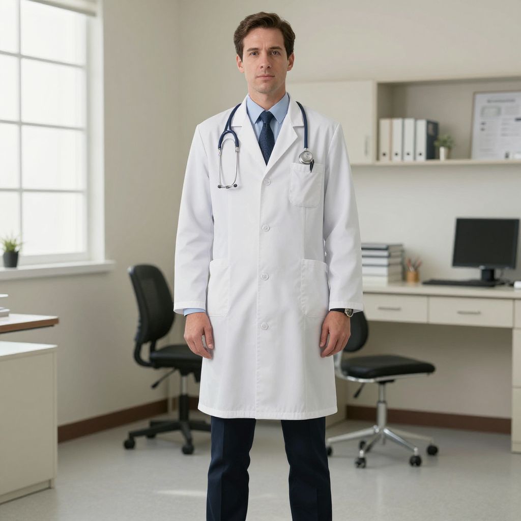 Doctor Season Costume, male doctor in a lab coat standing in a room