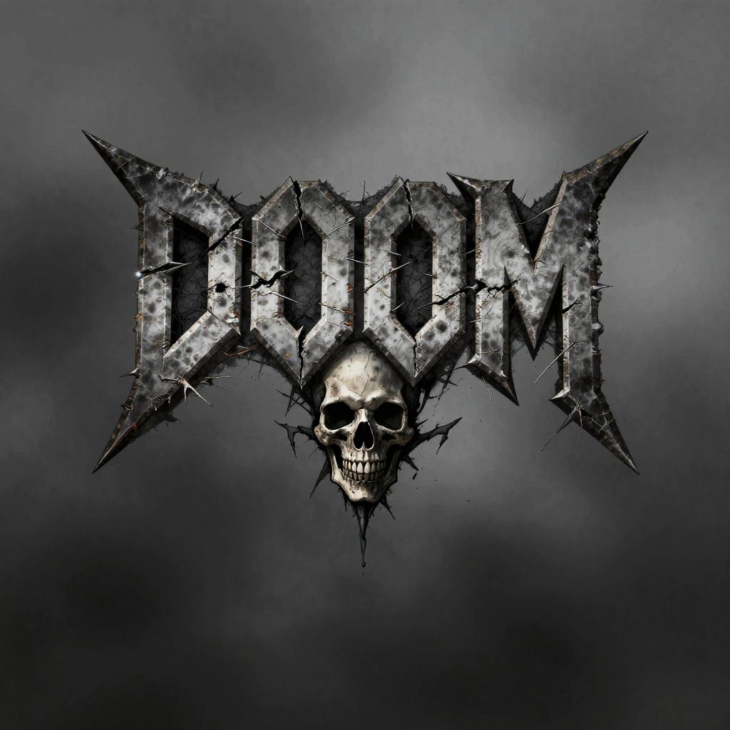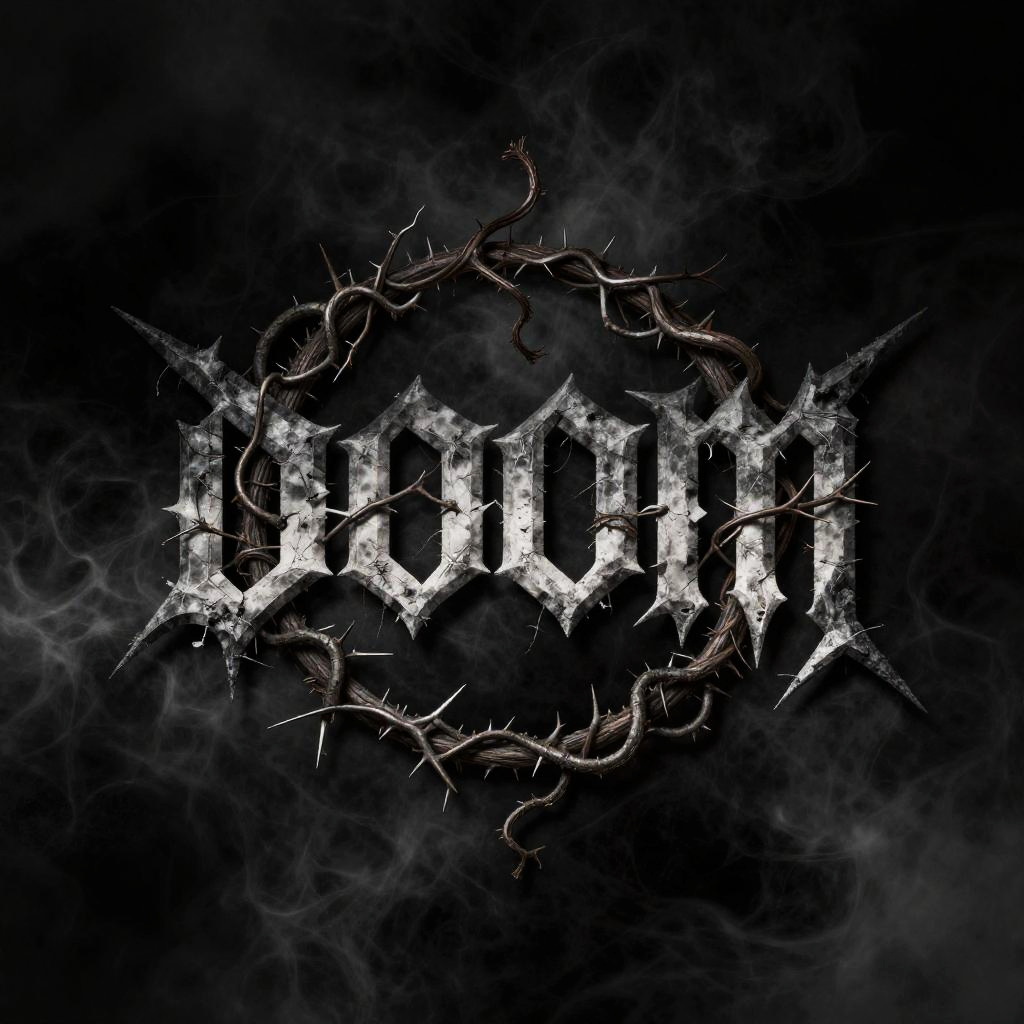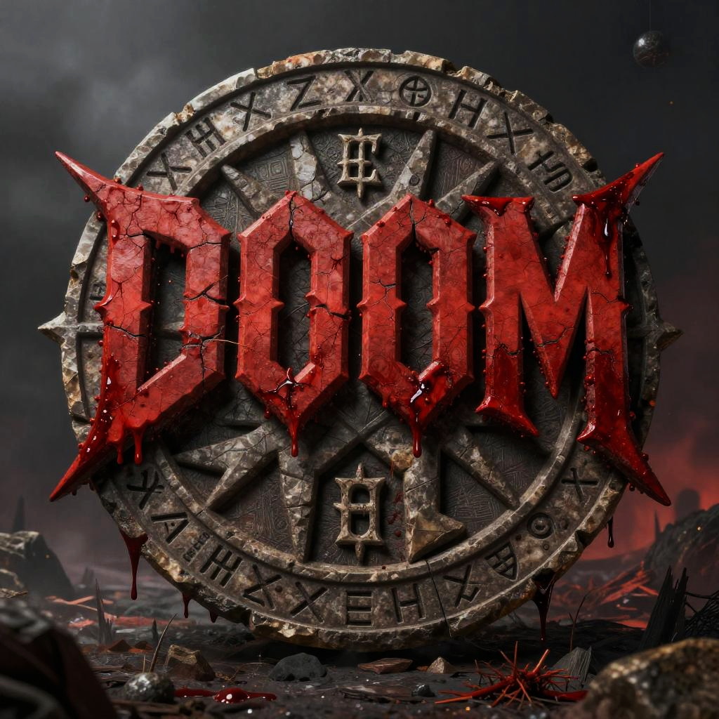 Doom band logo rendered in bold, dripping blood-red letters with cracked stone texture, surrounded by ancient runes and a desolate, apocalyptic landscape backdrop