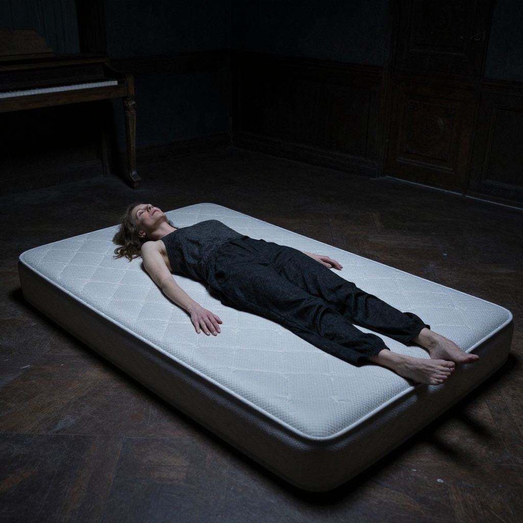 Photograph of a woman with fair skin and brown hair lying on a white, quilted mattress in a dark, wooden-floored room. She is dressed in a black, sleeveless jumpsuit and barefoot, with her arms and legs relaxed, and head tilted back. A wooden piano is partially visible in the dimly lit background. The lighting creates a stark contrast between the white mattress and the dark surroundings, emphasizing her relaxed, almost lifeless pose. The image has a moody, dramatic atmosphere.