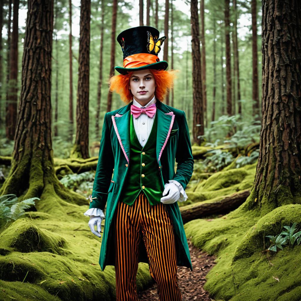 Photorealistic image of a young man wearing a 19th-century Victorian Willy Wonka-themed costume, featuring a purple velvet coat with gold trim, brown pinstripe pants, a gold waistcoat, a large brown top hat, and a patterned bow tie. He stands on a garden path lined with vibrant red and yellow flowers, with a brick building in the background during daytime. The subject has a serious expression and hands in pockets, portrayed with realistic lighting and detailed textures.