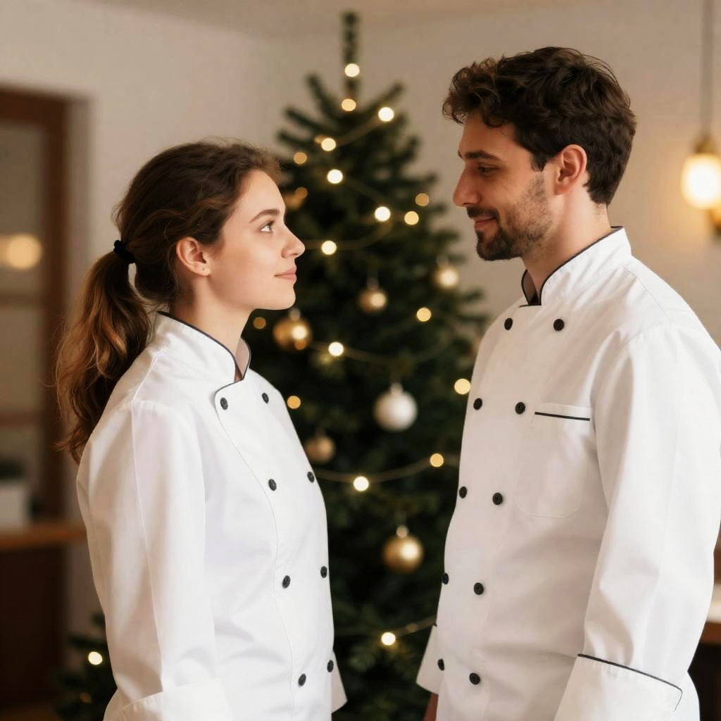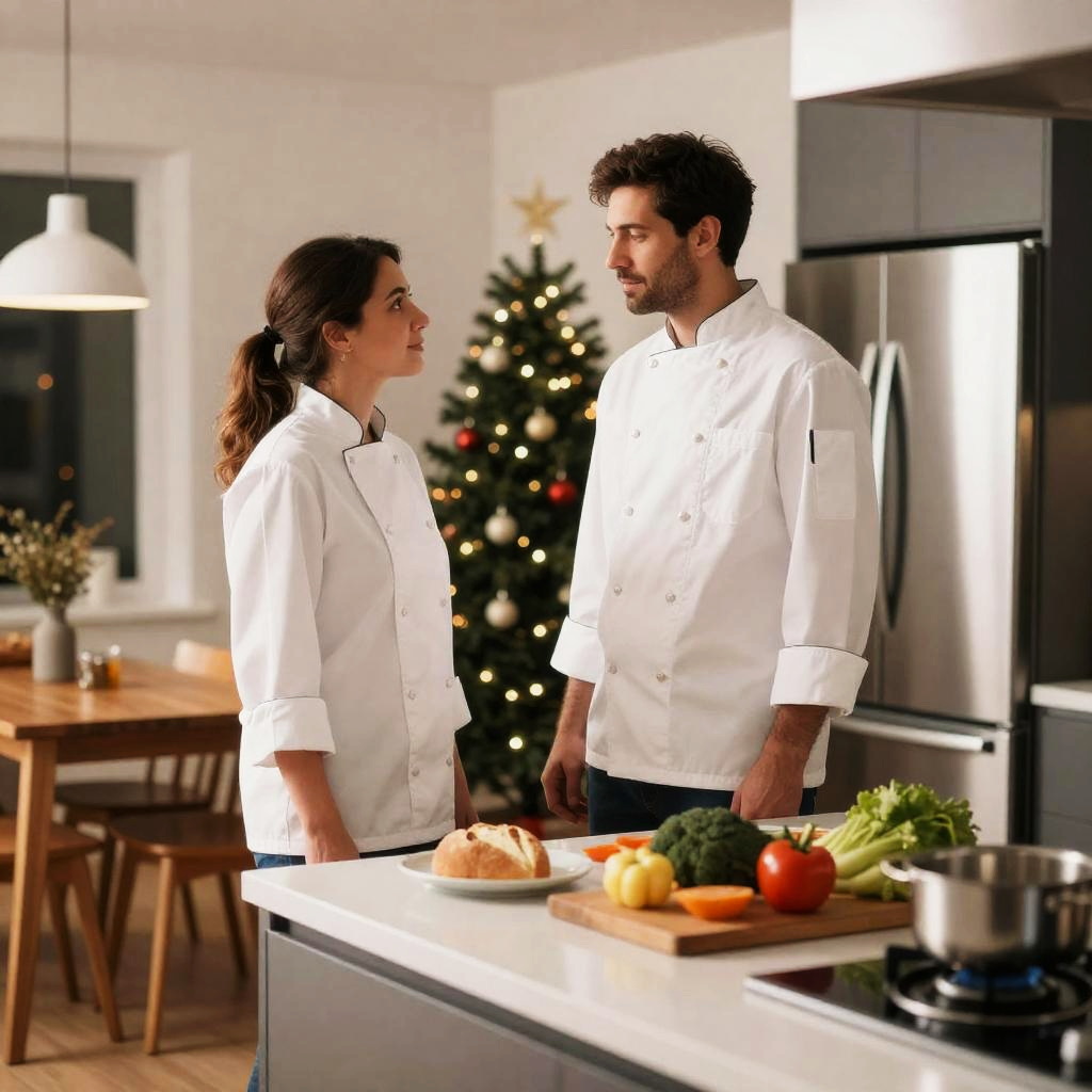 Photograph of a kitchen scene. A woman with long brown hair in a green blouse gently touches the nose of a man with short brown hair in a blue shirt and red Christmas-themed apron. She holds a paper towel, he stands close. Baking tray with cookies on the granite countertop, yellow bowl in the background. Bright window light.