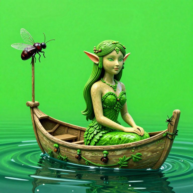 Accuracy fairy boat, elf lady in water, in the style of digital art wonders, made of insects, vivid color contrasts, green, flickr, hd, relief, ferrania p30,