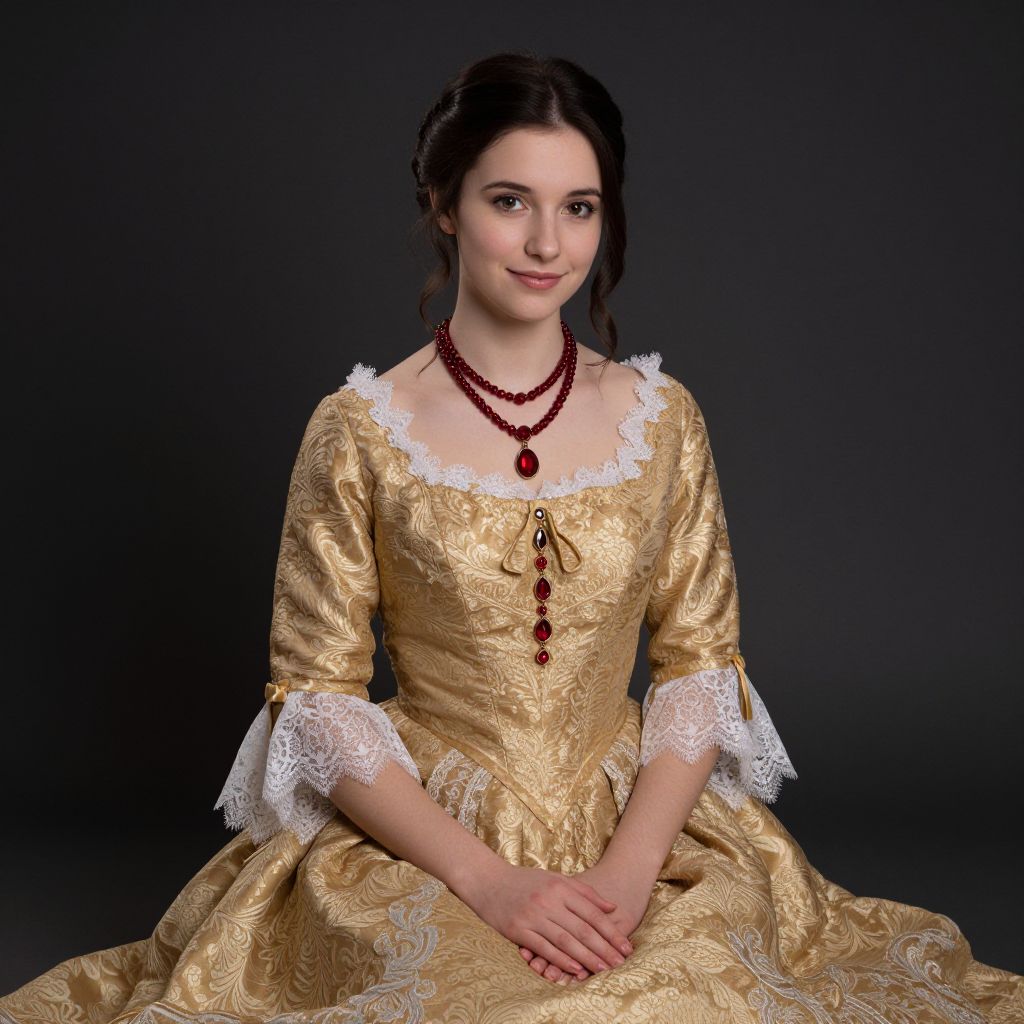 Photograph of a young woman with fair skin and dark brown hair in an updo, wearing an elaborate, gold brocade gown with white lace trim on the sleeves and neckline. She has a red bead necklace with matching red gemstones. She's seated against a dark, plain background, looking softly at the camera with a gentle smile. Her hands rest on her lap. The lighting highlights the texture of the gown.