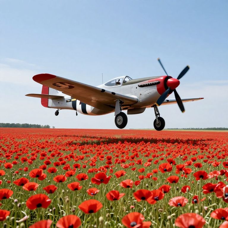 A vintage P-51 Mustang soars serenely above a vibrant sea of blooming red poppies, creating a surreal juxtaposition between the fierce history of warplanes and the tranquil beauty of nature.