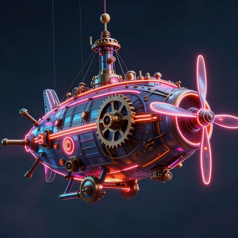 Photograph of a large, metallic airship with a cylindrical body and tall, central mast, silhouetted against a vibrant sunset sky. The airship, resembling early 20th-century design, has a ribbed, reflective surface and is floating above a cityscape with dark, shadowed buildings. The sky is a blend of deep purple, orange, and pink hues. Smoke trails from the lower part of the airship, adding contrast. The silhouette is sharp against the colorful background, emphasizing the airship's industrial, steampunk aesthetic.