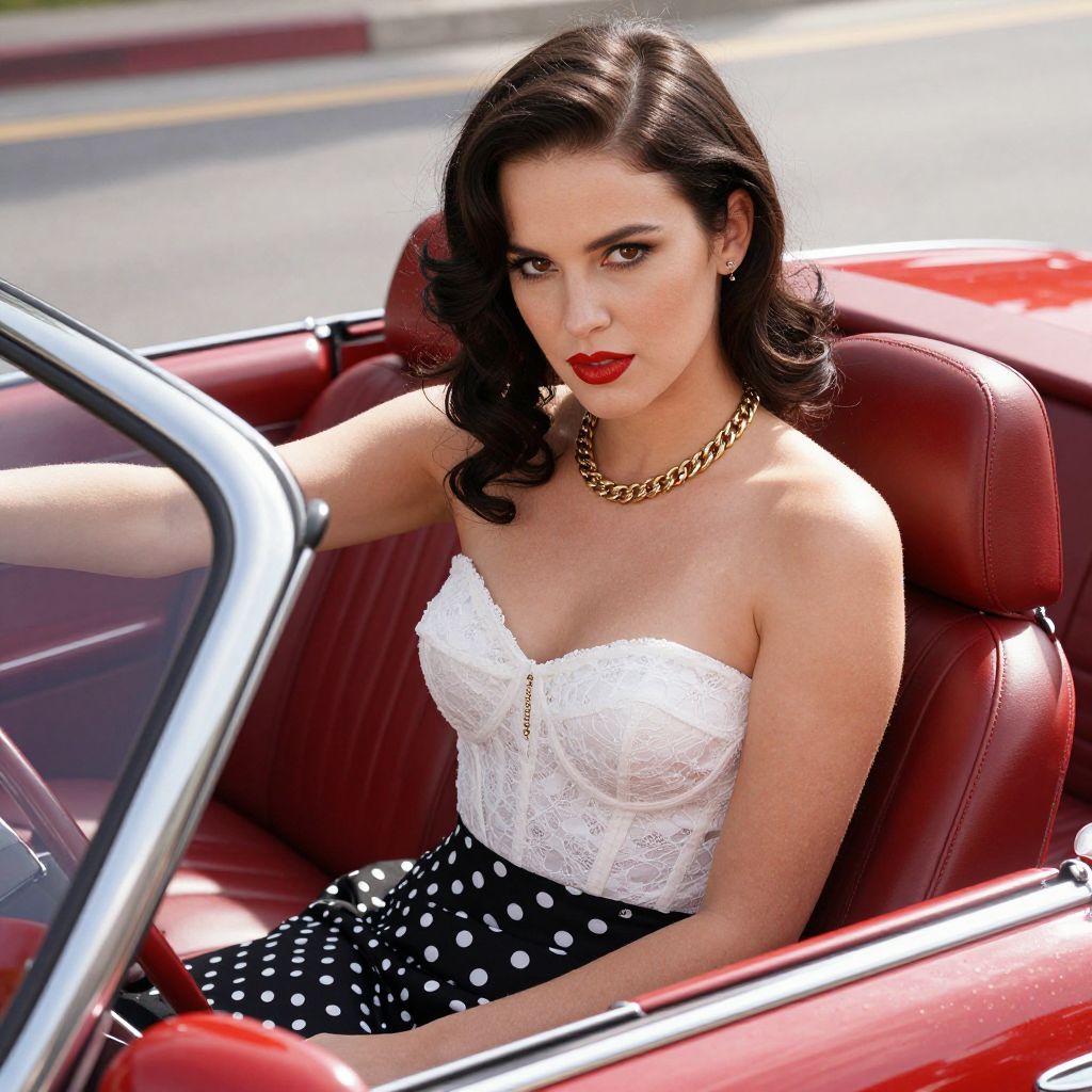 Photograph of a stylish woman with fair skin and dark brown, wavy hair sitting in a red vintage convertible. She's wearing a strapless, white lace corset with a sweetheart neckline, black polka-dot skirt, and a gold necklace. Her red lipstick matches the car's interior, and she's looking directly at the camera with a confident expression. Sunlight highlights her features, creating a glamorous, vintage vibe.