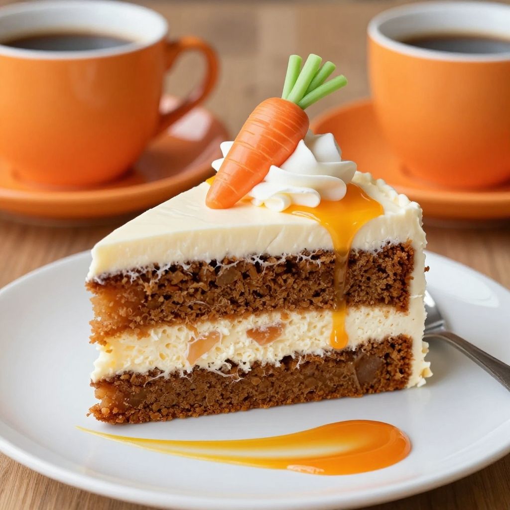 Close-up of a slice of carrot cake with layers of cream cheese frosting, topped with whipped cream, a carrot-shaped decoration, and orange glaze. The cake is served on a white plate with an orange sauce drizzle, accompanied by orange cups of coffee in the background on a wooden table.