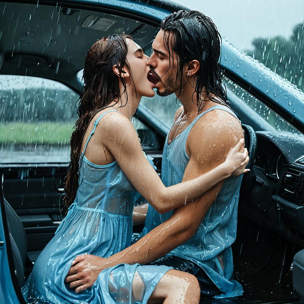 Intimate Moment in Rainy Car