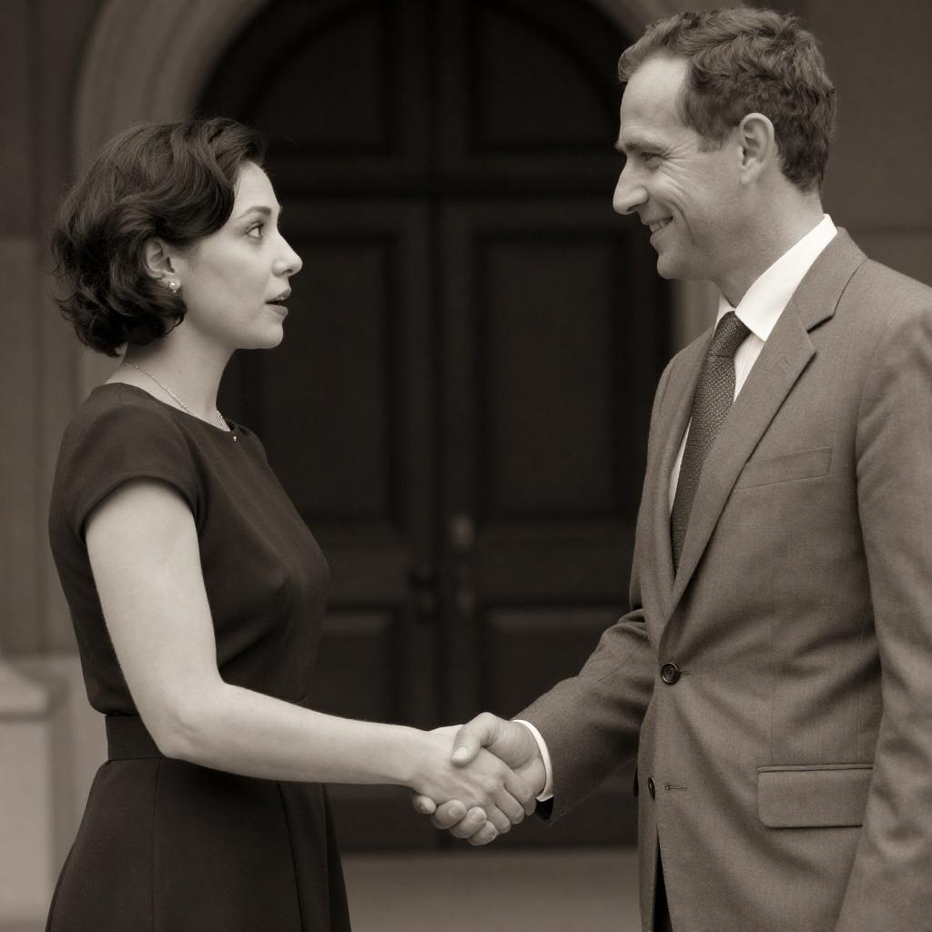Sepia-toned photograph of a man and woman shaking hands. The woman, with short dark hair and wearing a dark dress, looks slightly surprised. The man, in a light suit with a tie, smiles at her. They stand against a dark, arched background. The man's right hand holds the woman's left hand.