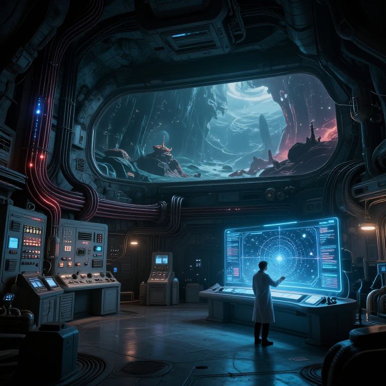 Concept art sci fi lab deep underground, walls lined with control panels and energy conduits, large observation windows overlooking alien landscapes, a lone researcher interacting with a holographic interface projecting star maps, enigmatic atmosphere, blending science fiction and exploration themes.
