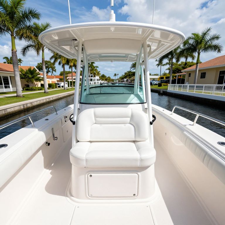 New 2019 Cobia 301 CC Center Console boat featuring a luxurious white leather captain's seat with storage compartment, positioned centrally within a spacious cockpit surrounded by white railings and a glass windshield, showcased for sale in West Palm Beach, FL.