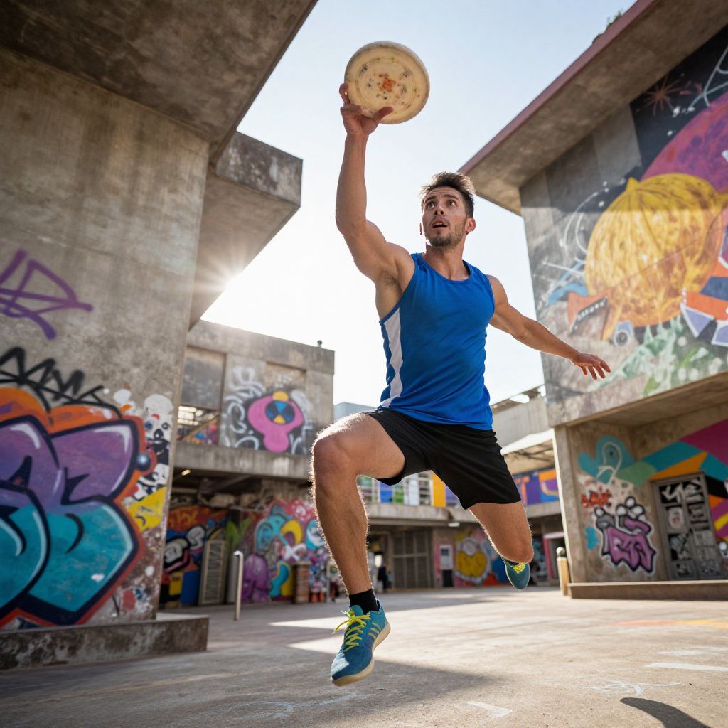 Captivating action shot of an agile athlete, mid-air as he leaps to catch the disc, radiating energy and determination, illuminated by streaks of sunlight, set amidst a kaleidoscope of colors, urban landscape, concrete walls, graffiti, dynamic perspective, shallow depth of field, vivid hues, captivating gaze, high resolution, perfect for wallpapers. Man has masculine face and piercing eyes