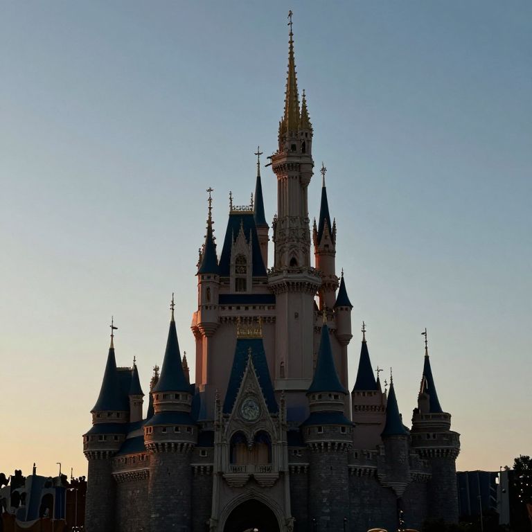 In the distance, the iconic silhouette of the Disney castle looms, its spires reaching towards the heavens, casting a majestic presence over the scene. The castle's intricate architectural details are subtly highlighted, adding depth and dimension to the image. The castle is positioned centrally, serving as a focal point that draws the viewer's eye across the composition.