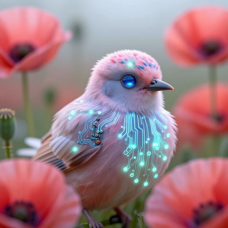 Close-up of opium bird AI nestled among poppy flowers, its eyes glowing with artificial intelligence, feathers made of circuit boards and soft petals, illuminated by soft bioluminescent light, peaceful yet uncanny mood