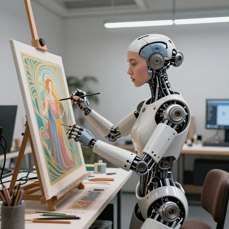 Ai female art showing an android artist in a digital studio painting virtual canvases, bright ambient lighting, intricate mechanical joints and art tools, blending creativity and technology, art nouveau influences with a sci-fi twist