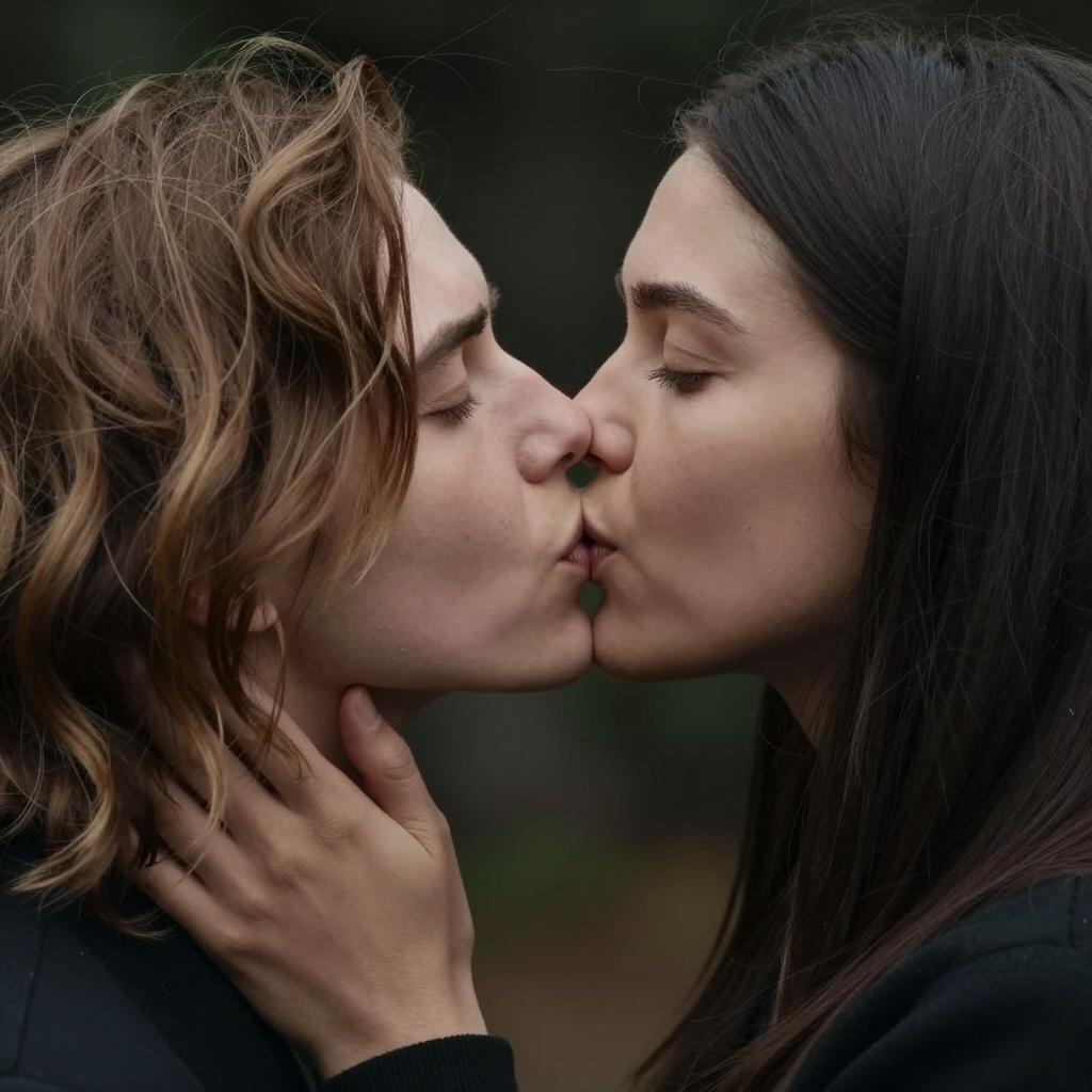A romantic moment between a couple kissing passionately outdoors. The woman has curly dark hair, wearing a light blue shirt and a patterned scarf. The man has light brown hair, dressed in a black leather jacket and a pink shirt. The background includes a blurred car and fence, suggesting an urban or street setting.
