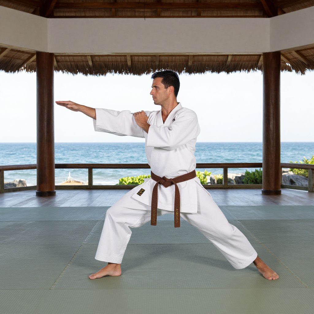 Photograph of a man in a white karate gi and brown belt, performing a karate stance on a green mat inside a bright, open room with wooden floors and columns. The background shows a stunning ocean view through large windows with thatched roof edges. His arms are extended in a powerful, balanced position. The scene feels calm yet focused.
