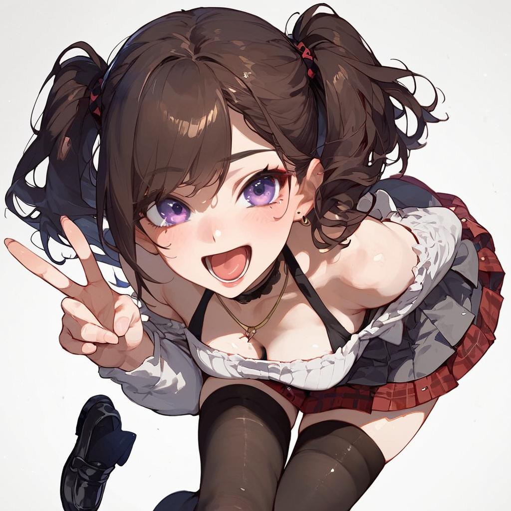 Score_9, score_8_up, score_7_up, source_anime, pinup of cute 1girl, solo, smile, open mouth, fang, leaning forward, v, looking at viewer, simple background, kmkgyui, medium hair, brown hair, twintails, purple eyes, medium breasts, grey dress, red plaid skirt, thighhighs, bare shoulders, choker, shoes, black thighhighs, necklace, zettai ryouiki, loafers