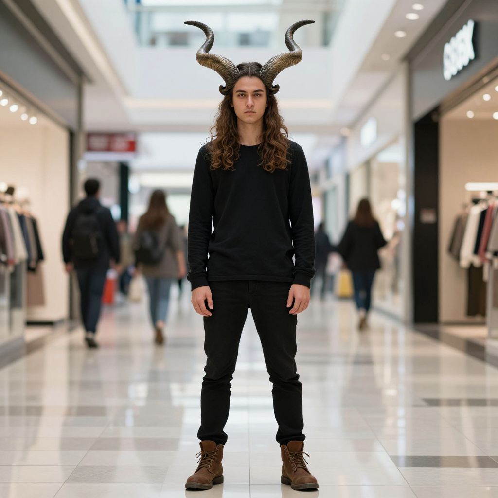 Photograph of a young man with long brown hair standing in a brightly lit mall corridor. He wears a black long-sleeve shirt, black pants, and brown lace-up boots. He has large, curved, black and white goat-like horns on his head. The background features blurred shoppers, illuminated store signs, and a shiny white tiled floor. The man's expression is neutral, and he stands confidently at the center of the image. The overall style is modern and slightly surreal due to the horns.