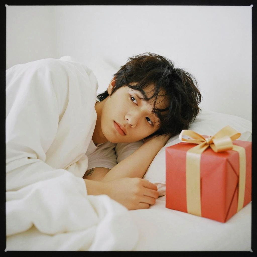 Photograph of a young person with short dark hair lying in bed, covered with a white blanket. They're looking to the side with a relaxed expression. To the right, there's a bright red gift box with a gold ribbon. The background is mostly white with a black edge at the top and bottom. The overall vibe is cozy and peaceful.